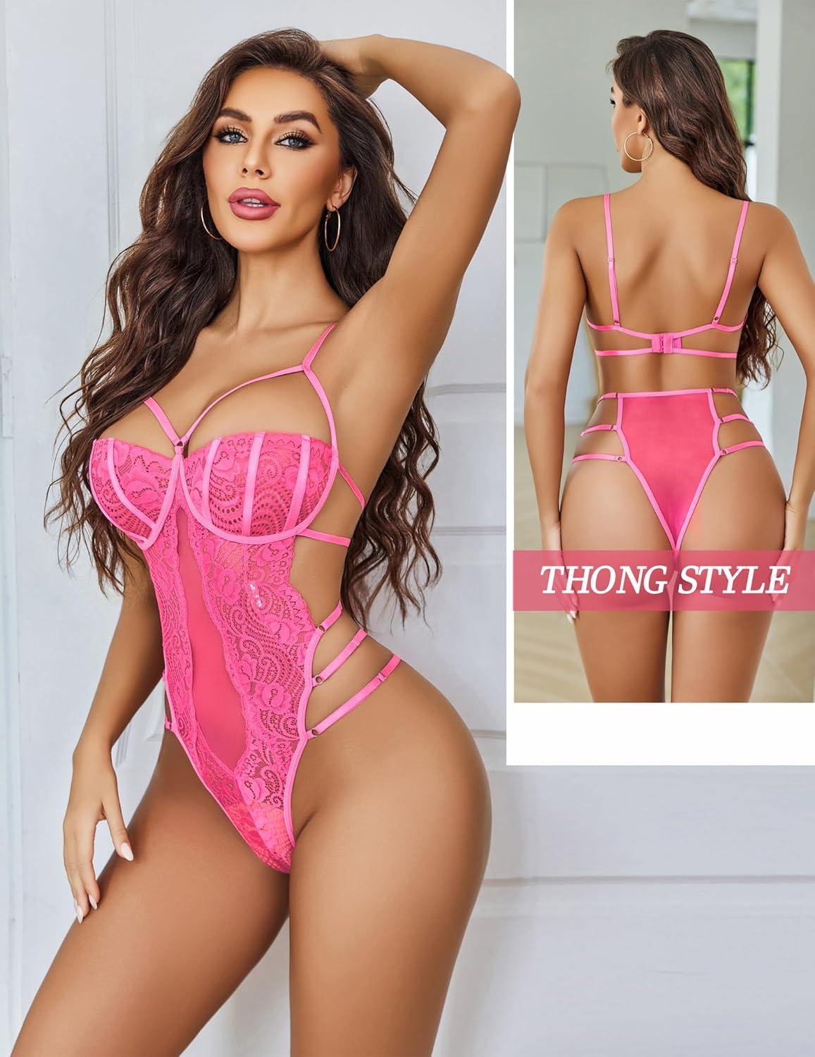 Avidlove Women Teddy Lingeries Sexy Lingerie Strappy Lace Bodysuit Deep V One Piece Babydoll(Rose Red)