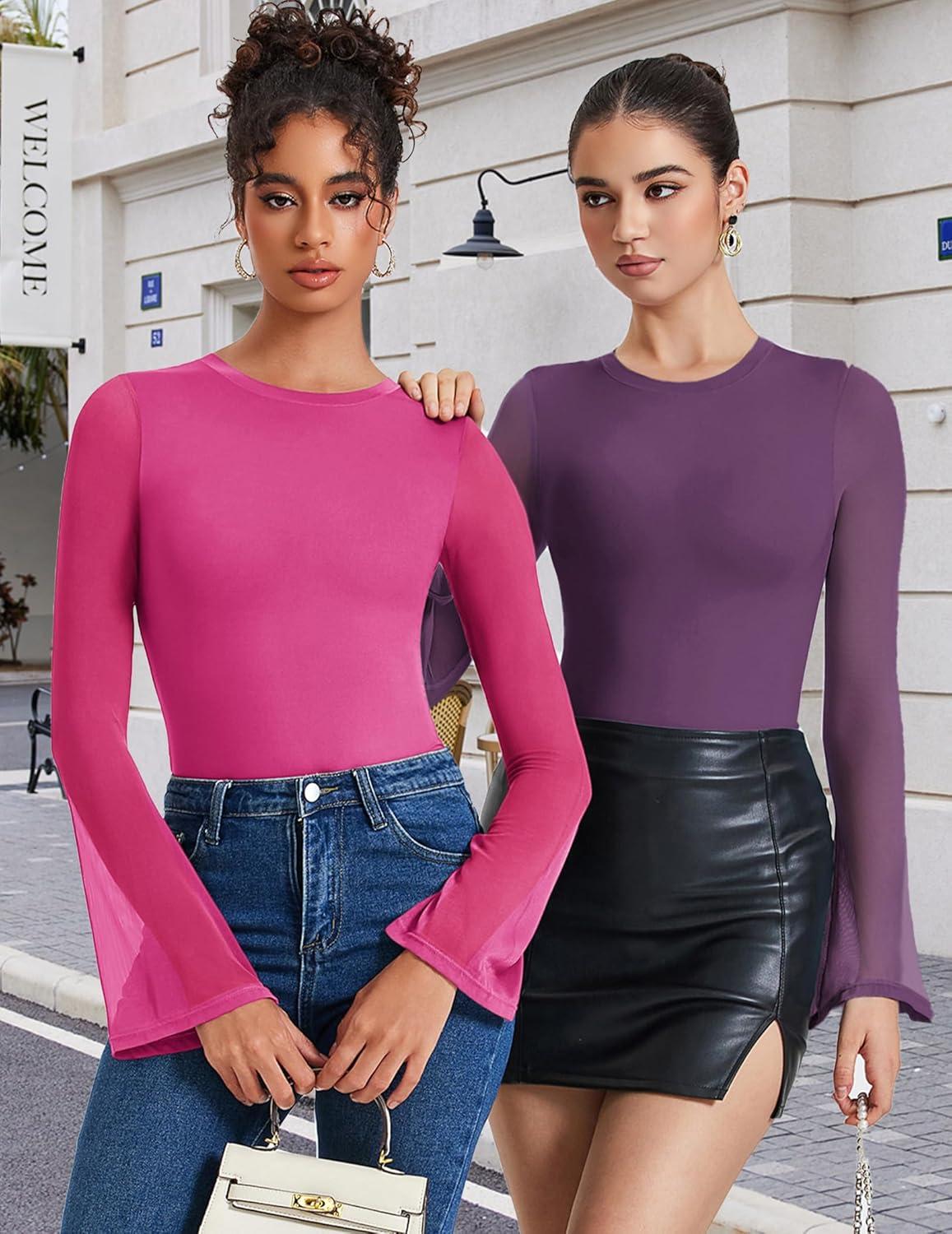 Avidlove Women’s Bell Long Sleeve Bodysuits Thong Crew Neck Mesh Body Suit Going Out Leotard Tops(Rose Red)