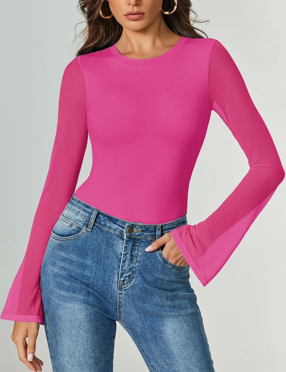 Avidlove Women's Bell Long Sleeve Bodysuits Thong Crew Neck Mesh Body Suit Going Out Leotard Tops(Rose Red)