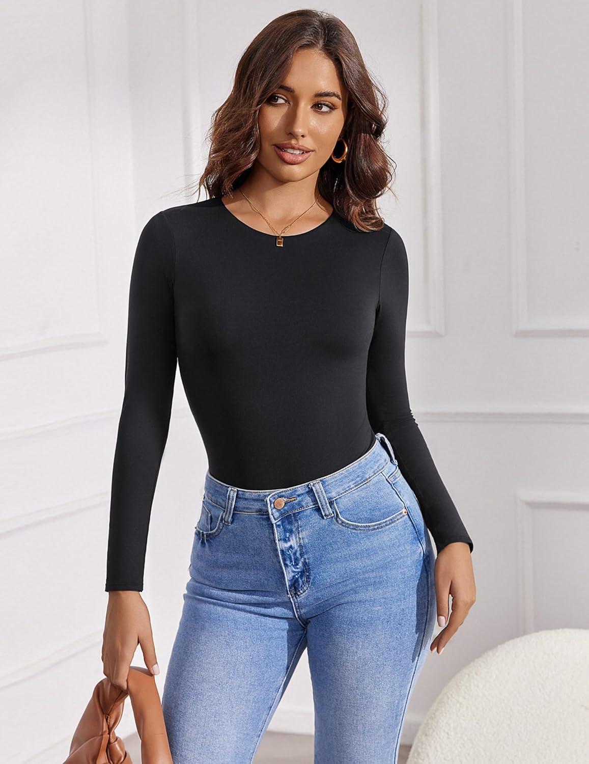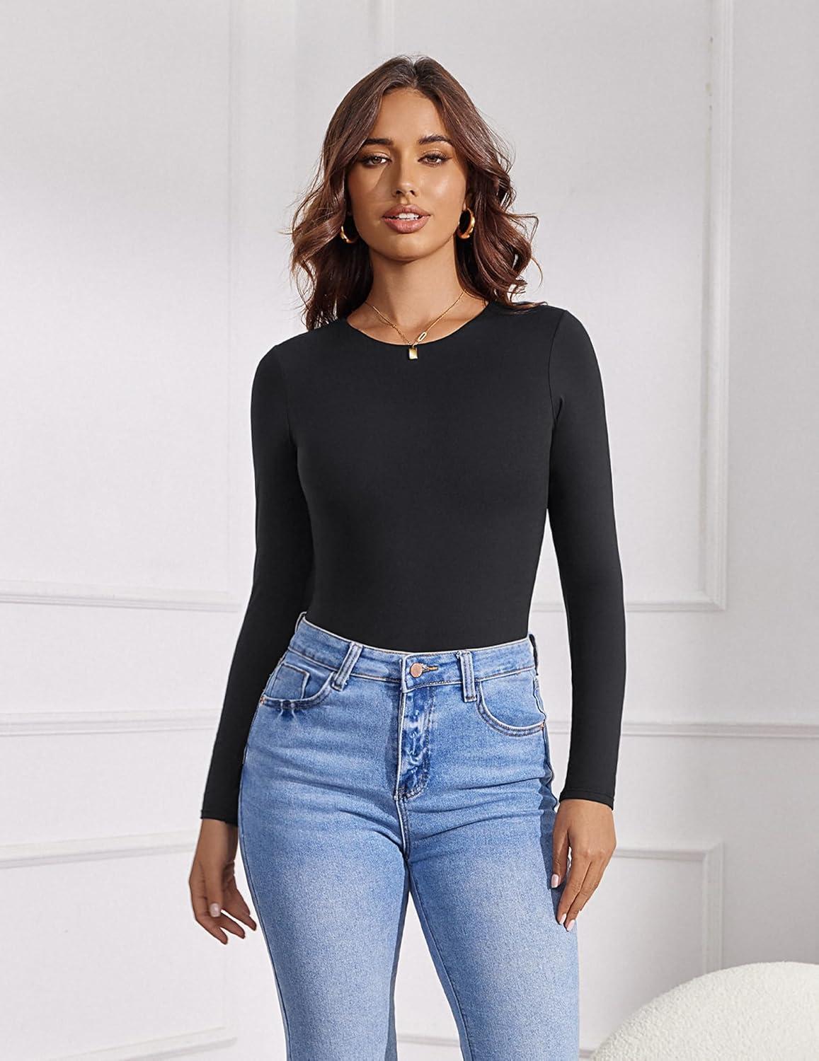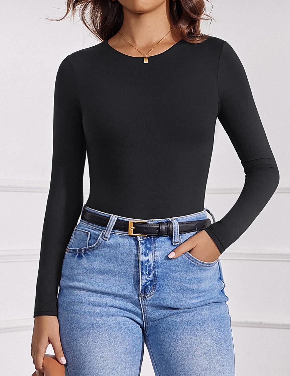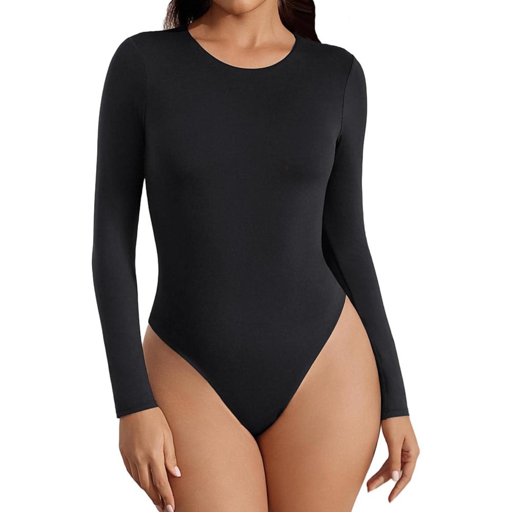 imageAvidlove Womens Crew Neck Long Sleeve Bodysuits Basic Slim Tops Double Lined Thong BodysuitBlack