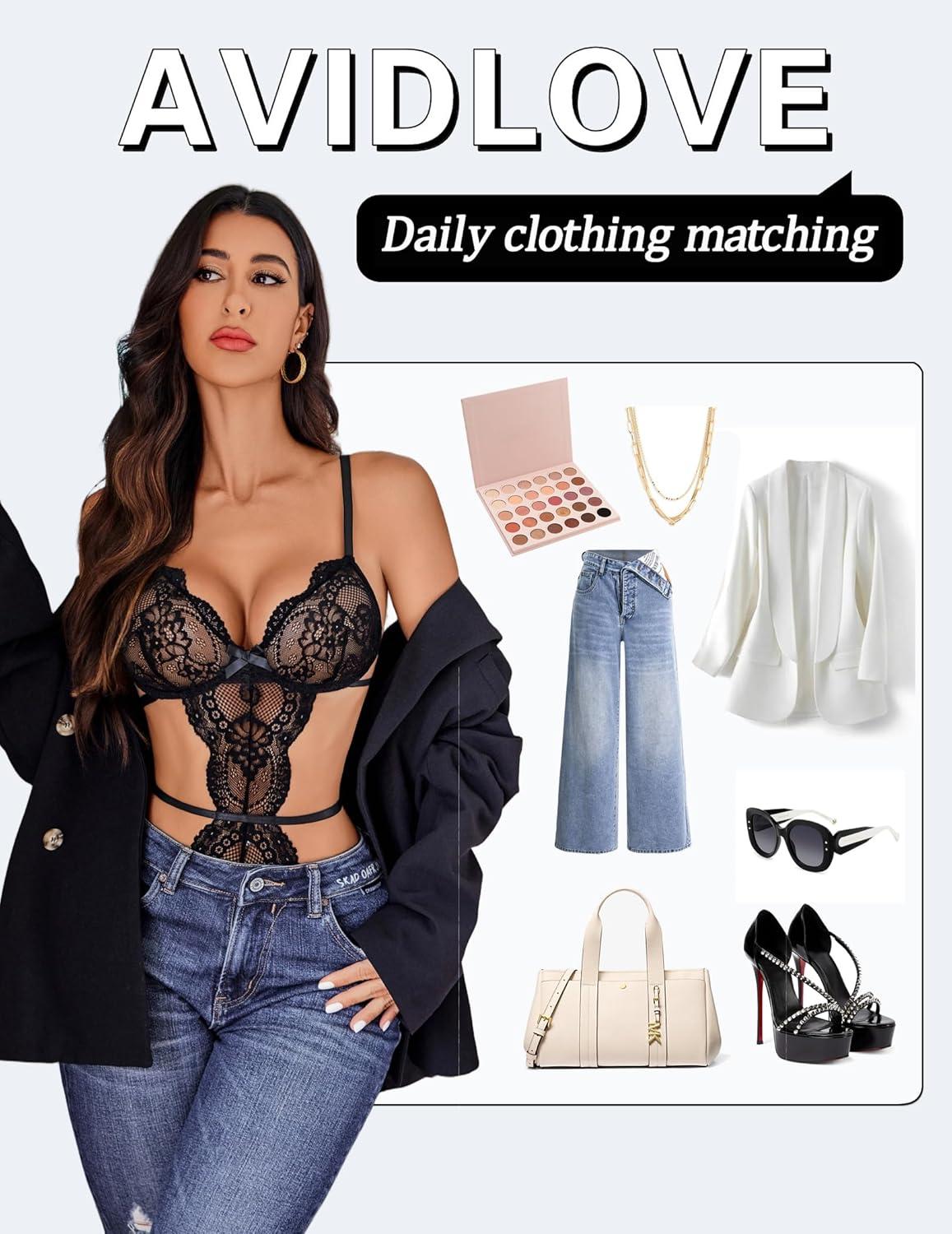 imageAvidlove Womens Deep V Teddy Lingerie Sexy Lace Bodysuit Cut Out Garter Lingerie SetsBlack