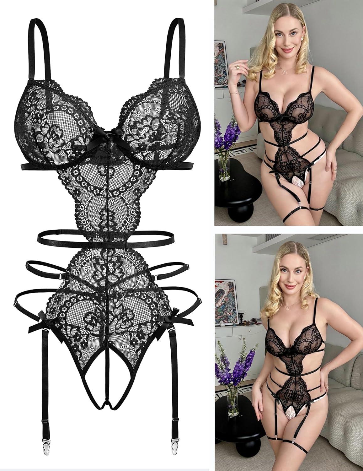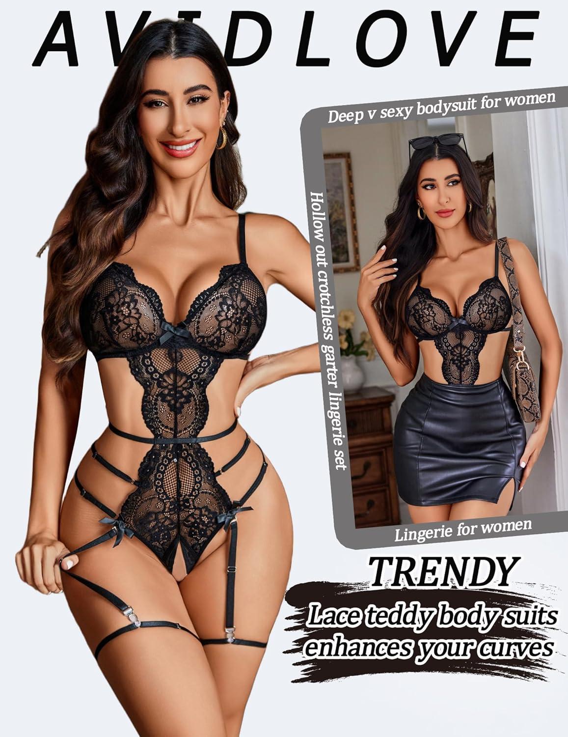 Avidlove Women’s Deep V Teddy Lingerie Sexy Lace Bodysuit Cut Out Garter Lingerie Sets(Black)