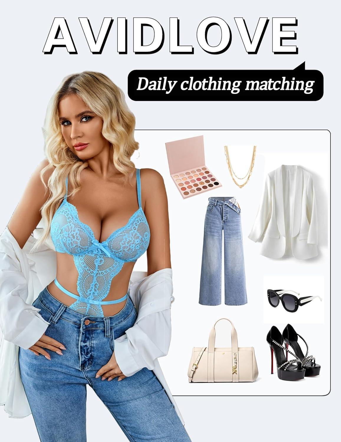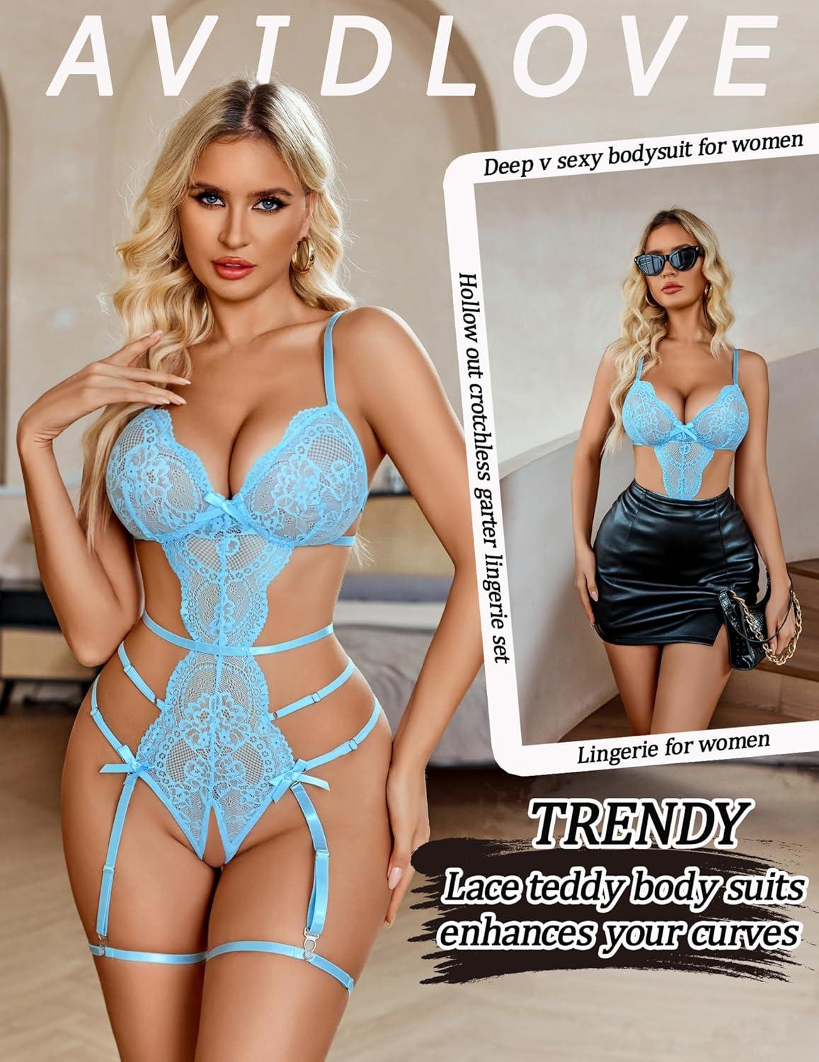 imageAvidlove Womens Deep V Teddy Lingerie Sexy Lace Bodysuit Cut Out Garter Lingerie SetsLight Blue