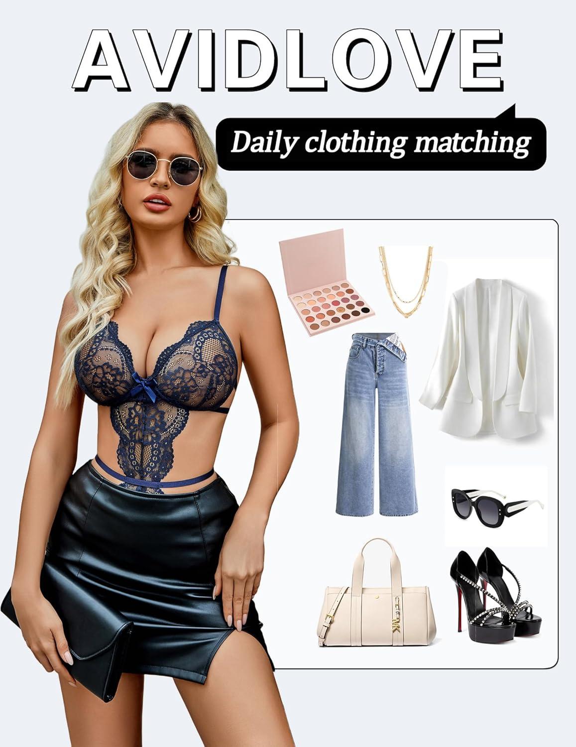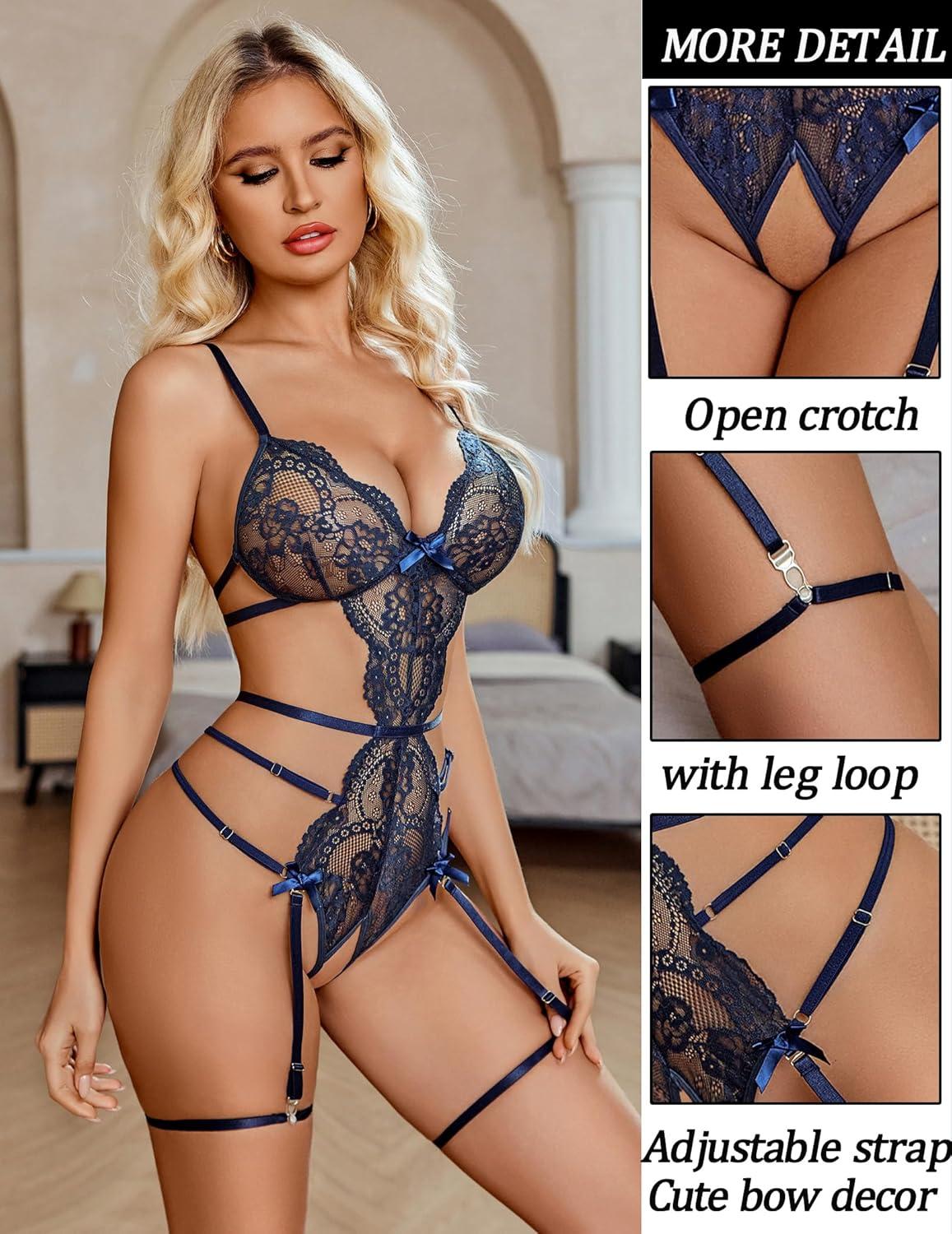 imageAvidlove Womens Deep V Teddy Lingerie Sexy Lace Bodysuit Cut Out Garter Lingerie SetsNavy Blue
