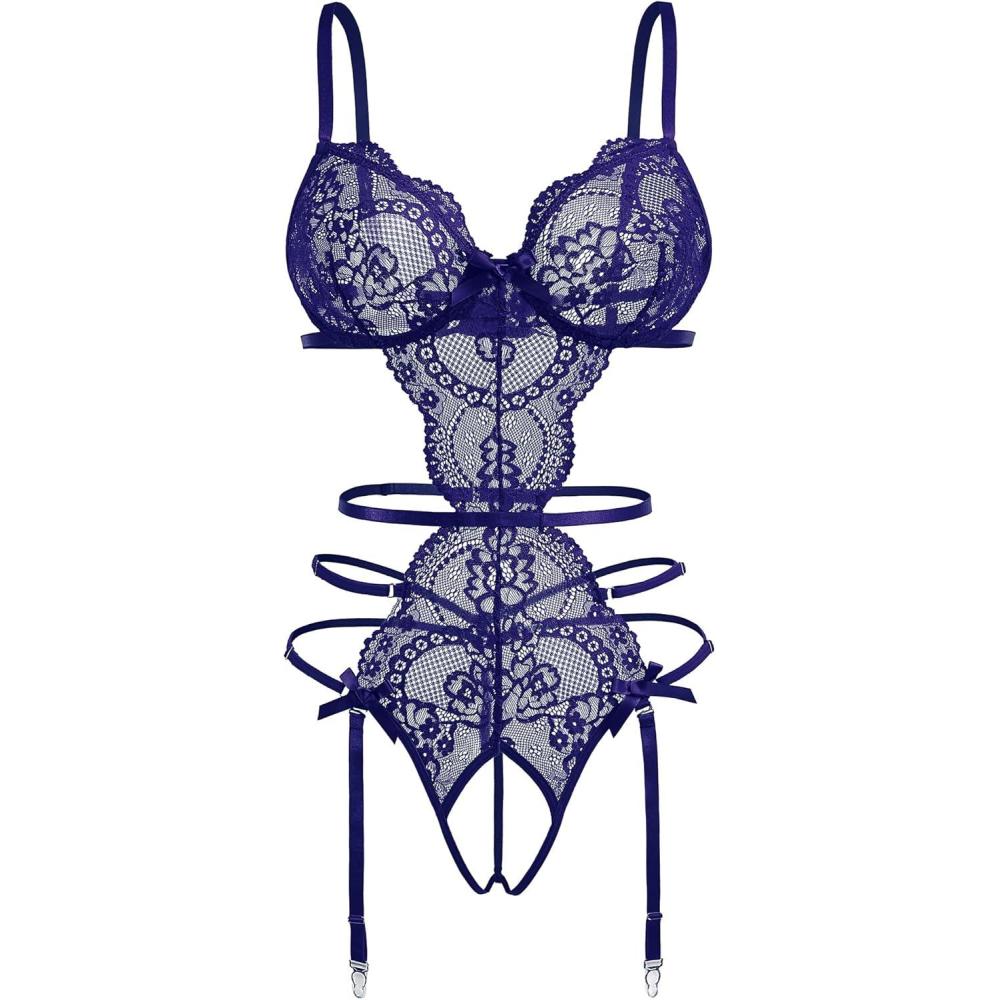 Avidlove Women’s Deep V Teddy Lingerie Sexy Lace Bodysuit Cut Out Garter Lingerie Sets(Navy Blue)