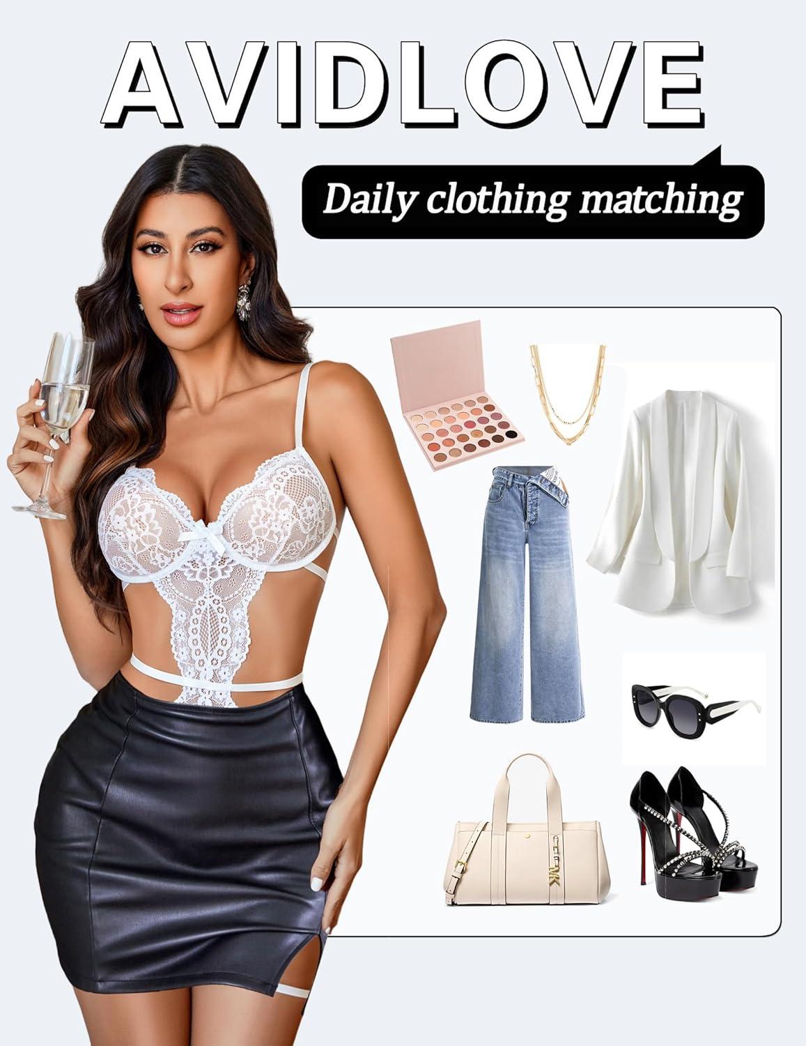 imageAvidlove Womens Deep V Teddy Lingerie Sexy Lace Bodysuit Cut Out Garter Lingerie SetsWhite
