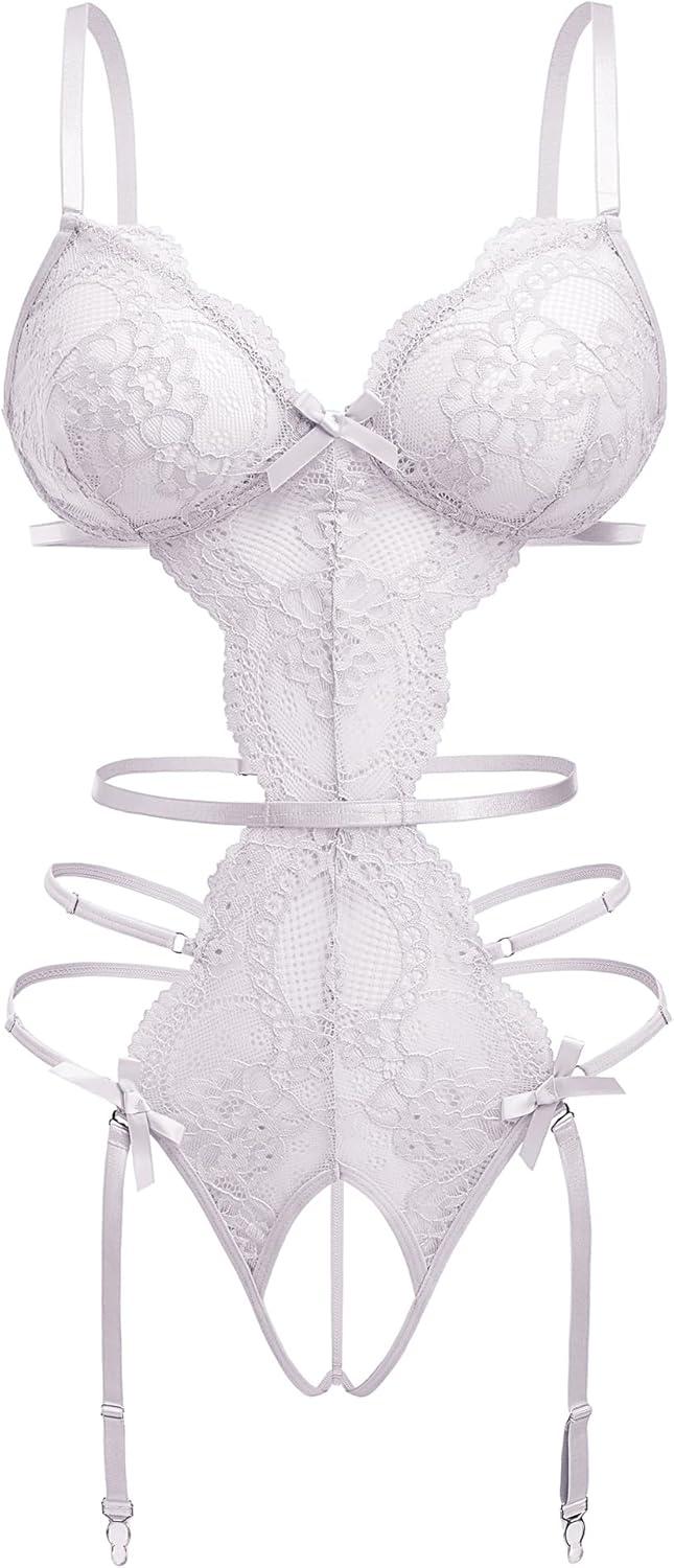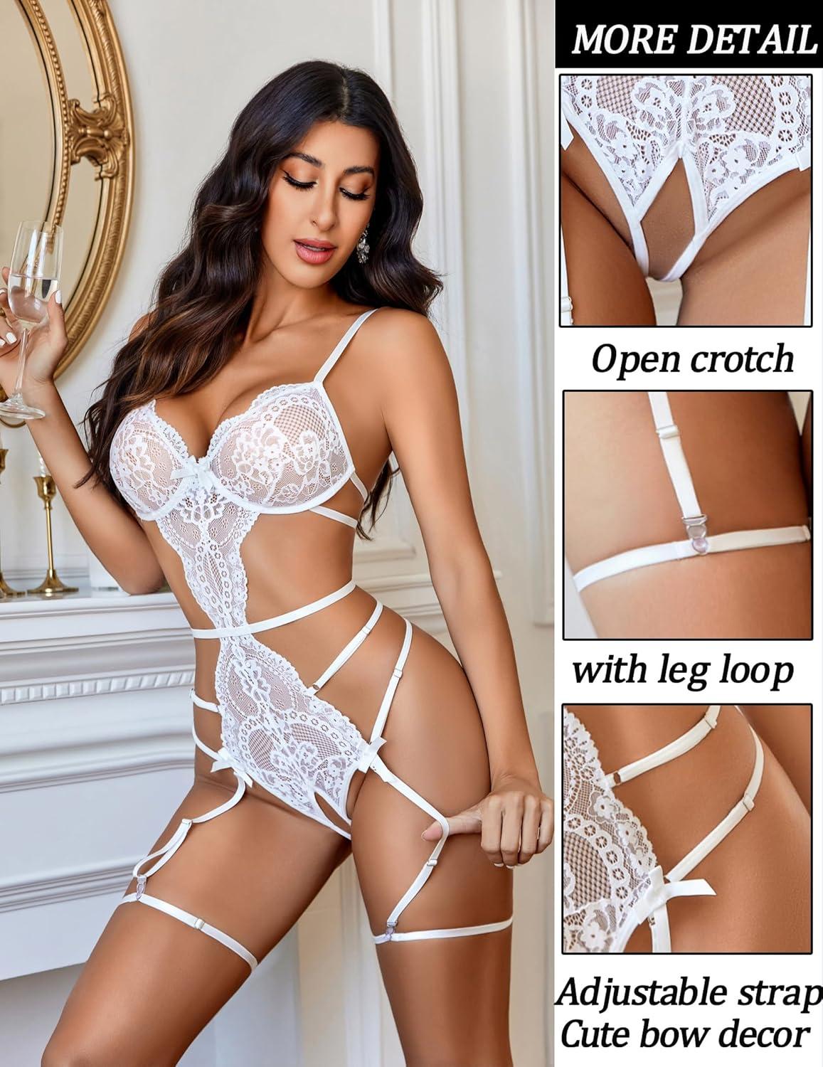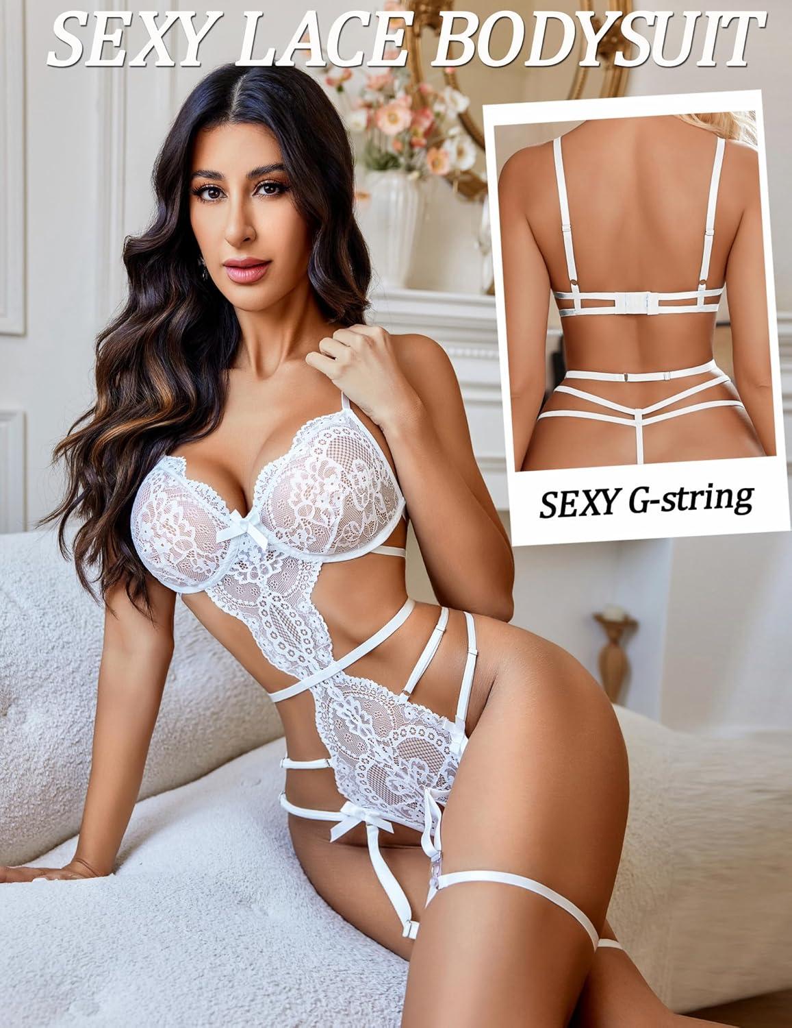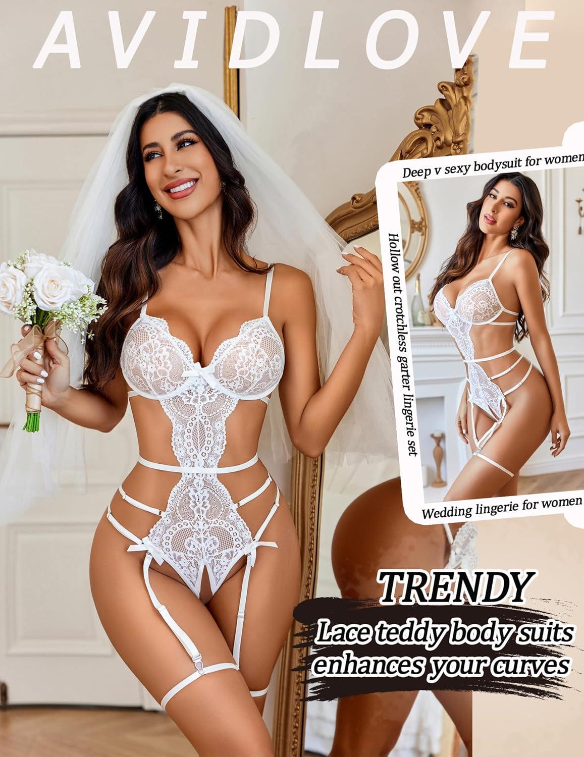 Avidlove Women’s Deep V Teddy Lingerie Sexy Lace Bodysuit Cut Out Garter Lingerie Sets(White)
