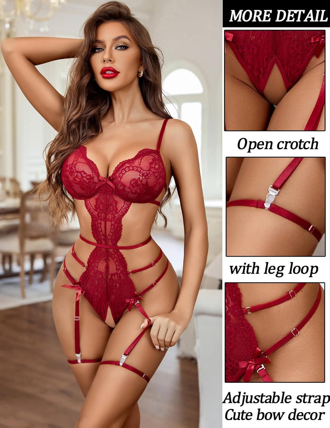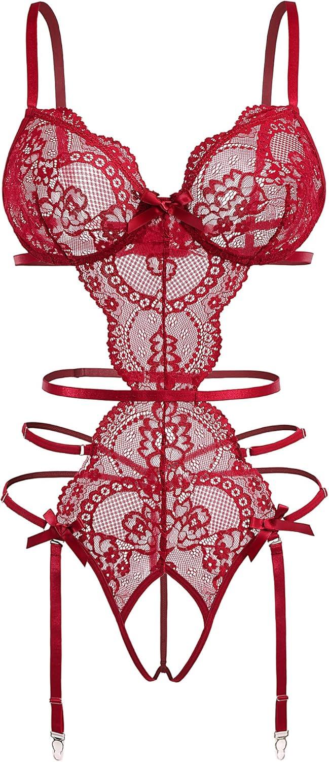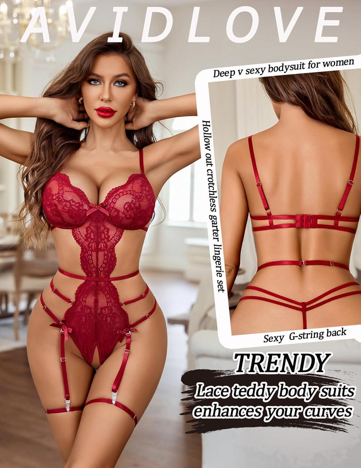 Avidlove Women’s Deep V Teddy Lingerie Sexy Lace Bodysuit Cut Out Garter Lingerie Sets(Wine Red)