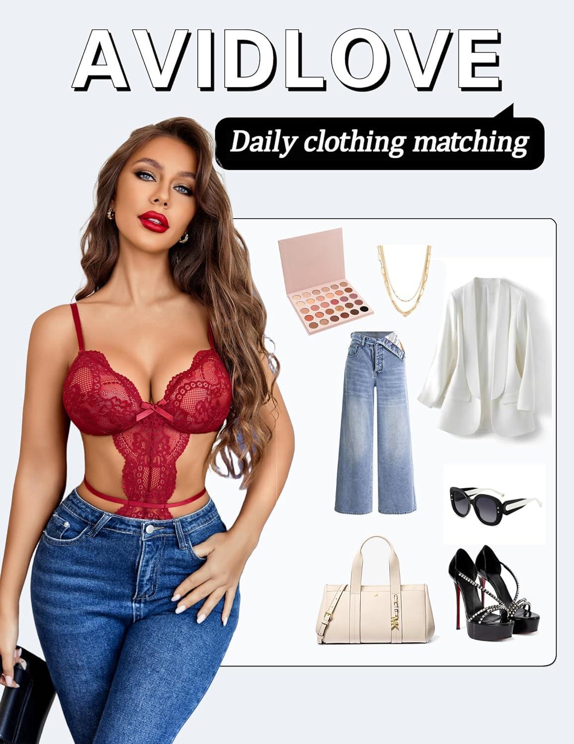 imageAvidlove Womens Deep V Teddy Lingerie Sexy Lace Bodysuit Cut Out Garter Lingerie SetsWine Red