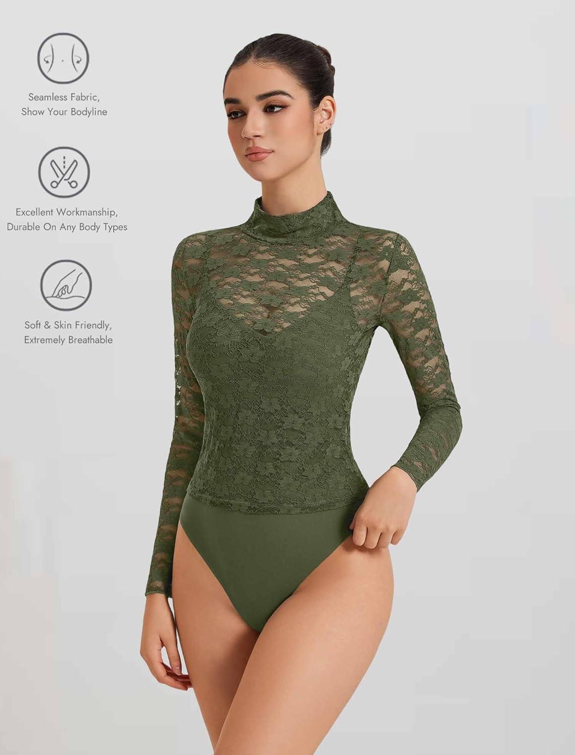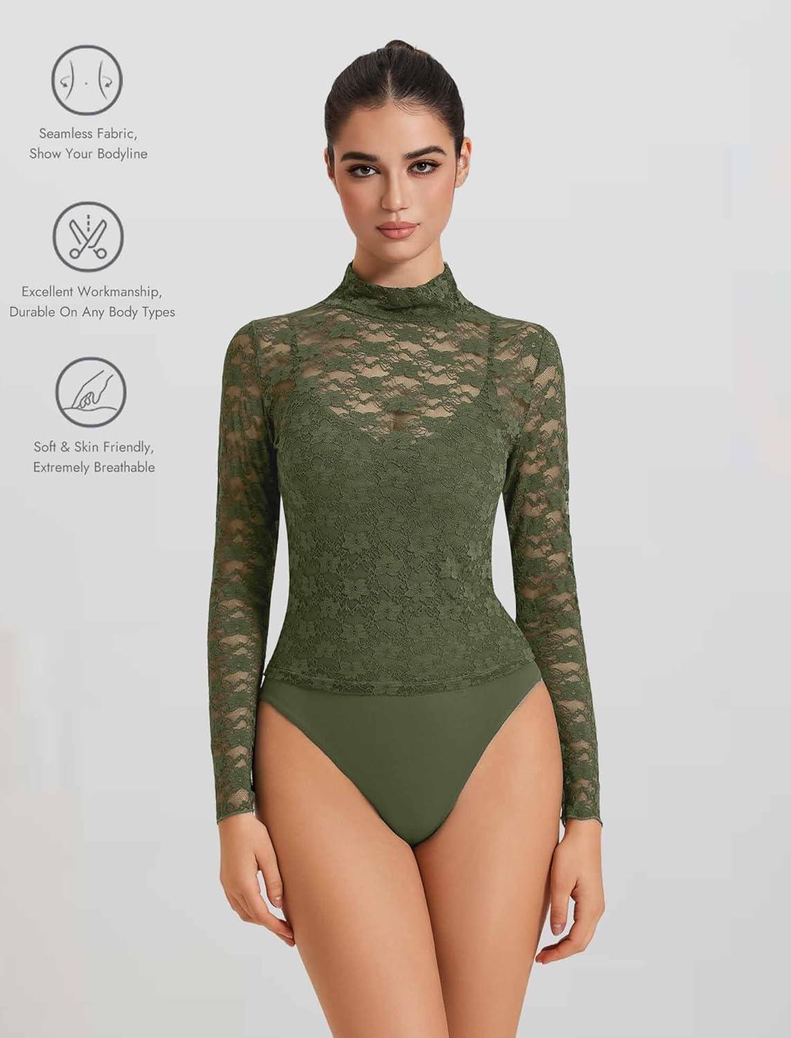imageAvidlove Womens Long Sleeve Bodysuit Lace Tops Turtle Neck Shapewear Body Suits Going Out Top Fall Outfits Two Piece SetArmy Green