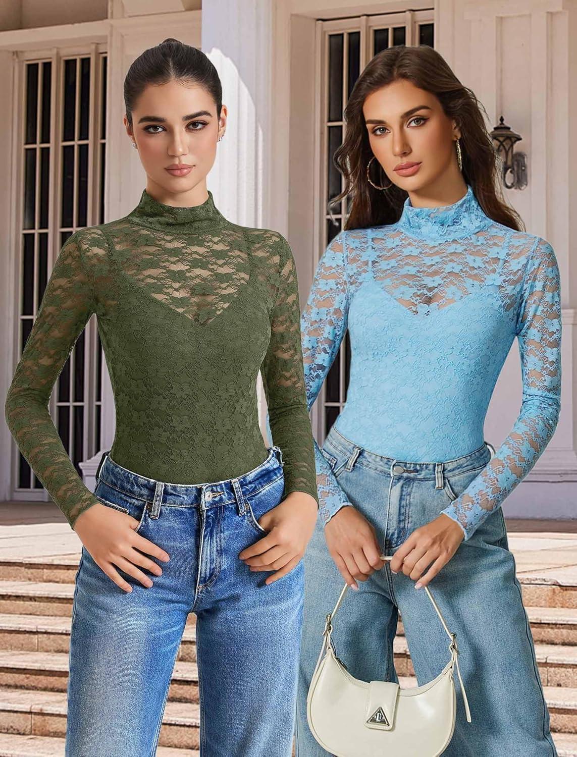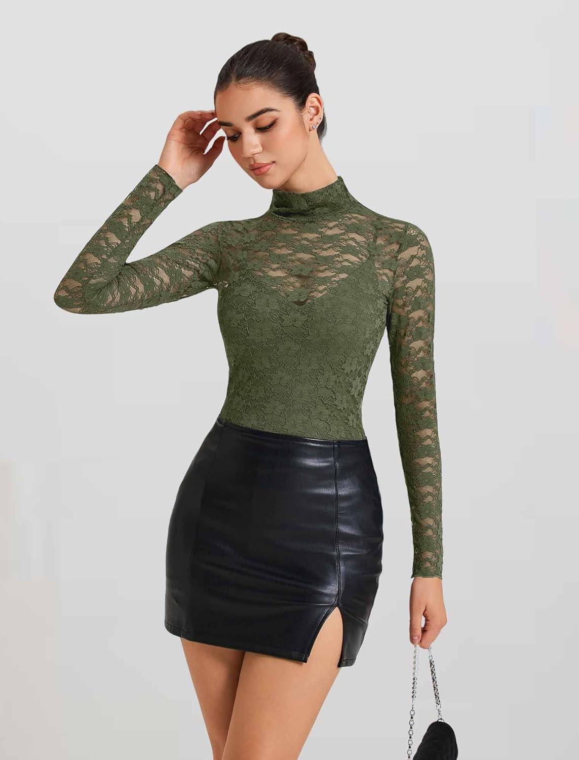 Avidlove Womens Long Sleeve Bodysuit Lace Tops Turtle Neck Shapewear Body Suits Going Out Top Fall Outfits Two Piece Set(Army Green)