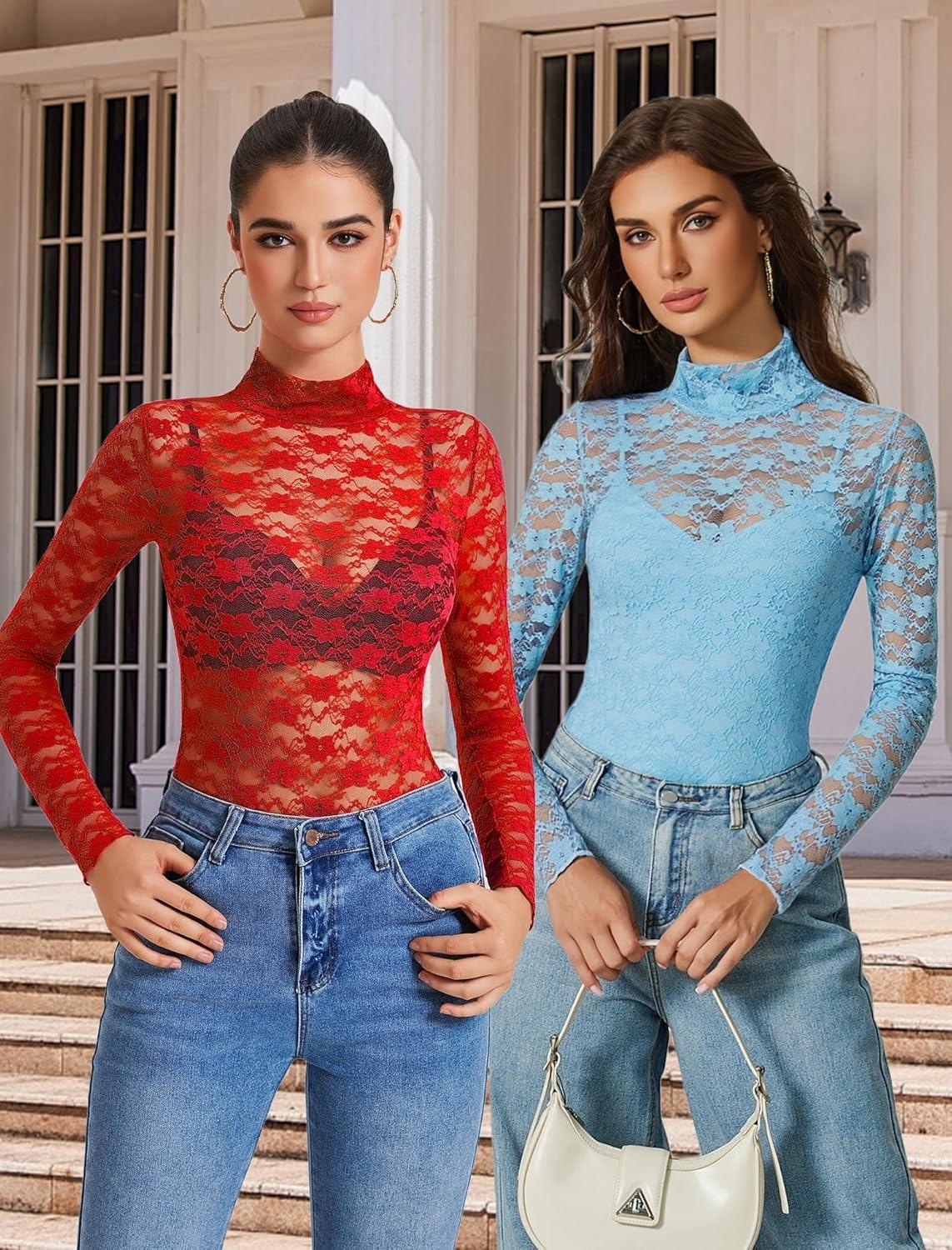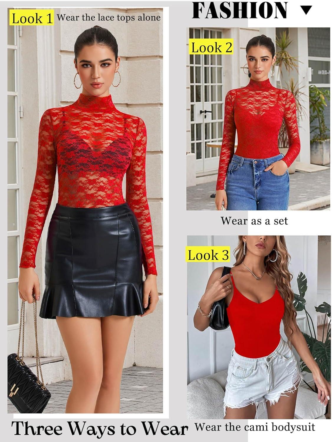 Avidlove Womens Long Sleeve Bodysuit Lace Tops Turtle Neck Shapewear Body Suits Going Out Top Fall Outfits Two Piece Set(Red)