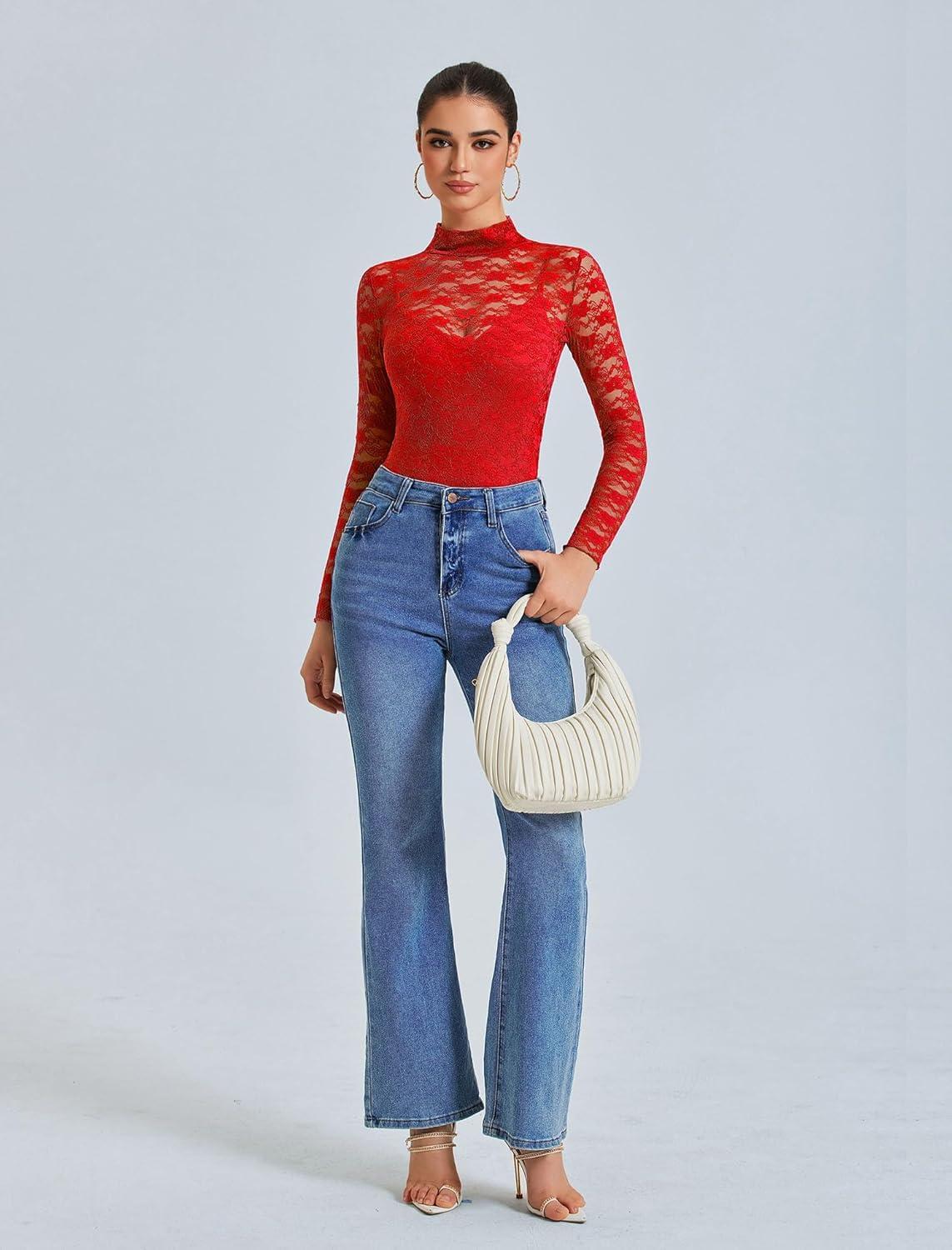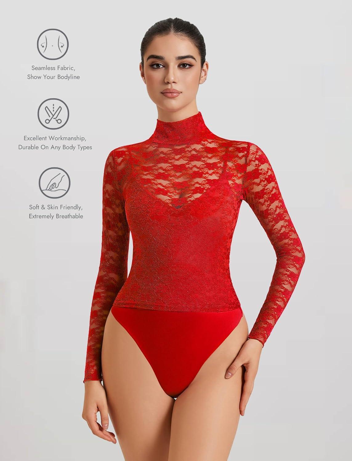 imageAvidlove Womens Long Sleeve Bodysuit Lace Tops Turtle Neck Shapewear Body Suits Going Out Top Fall Outfits Two Piece SetRed