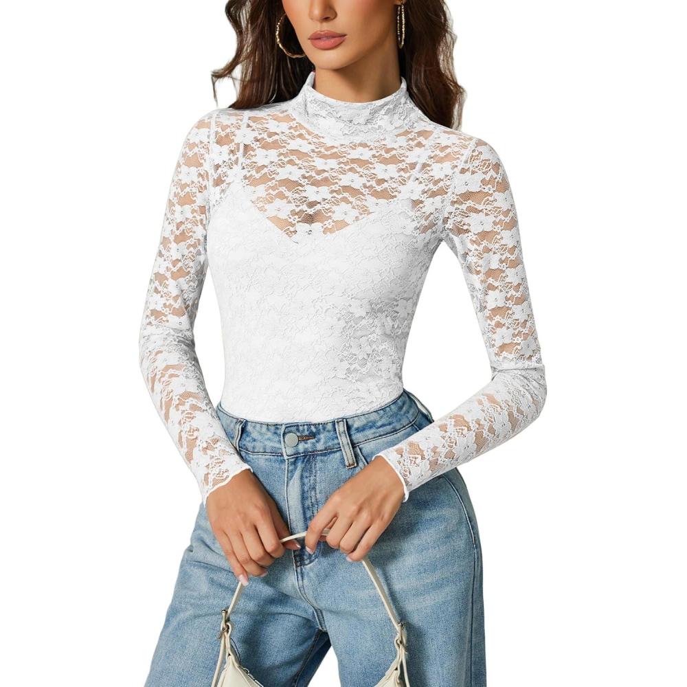 Avidlove Womens Long Sleeve Bodysuit Lace Tops Turtle Neck Shapewear Body Suits Going Out Top Fall Outfits Two Piece Set(White)