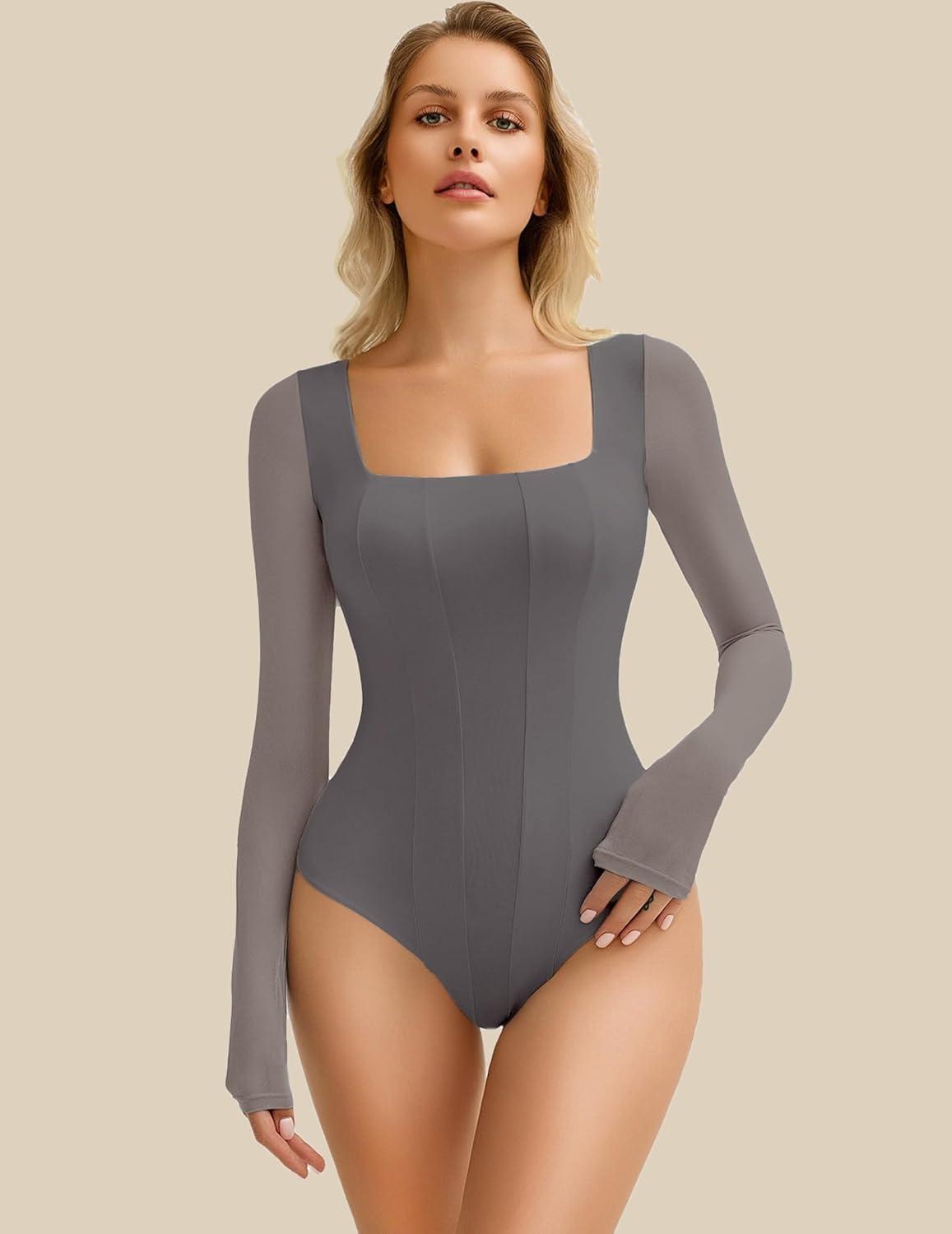 Avidlove Women’s Long Sleeve Bodysuits Square Neck One Piece Body Suit Mesh Leotard Tops Double Lined Soft(Grey)