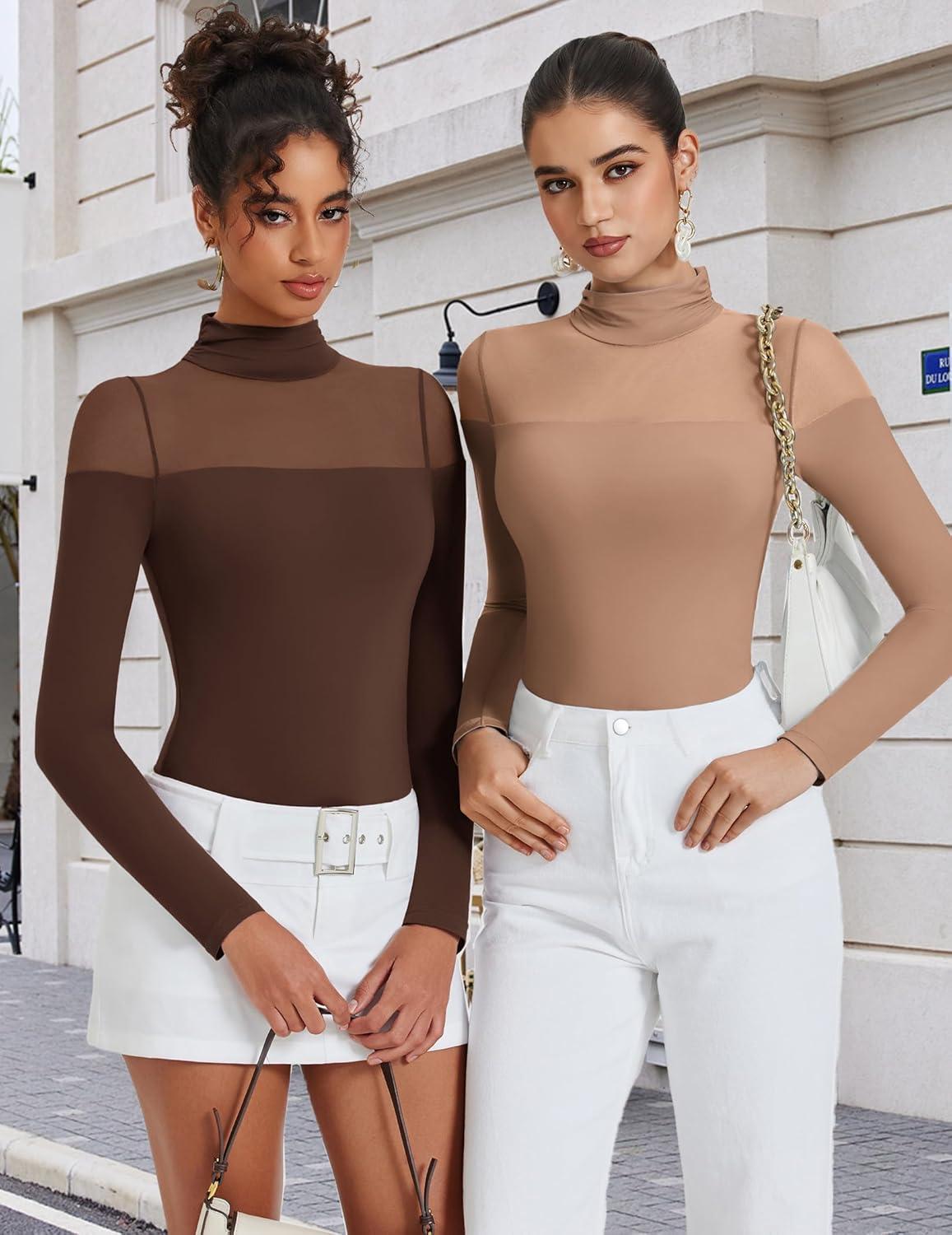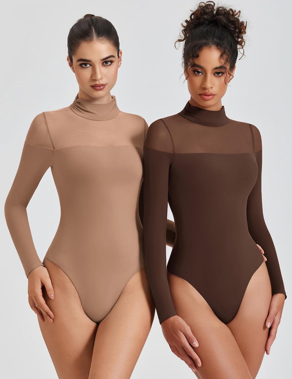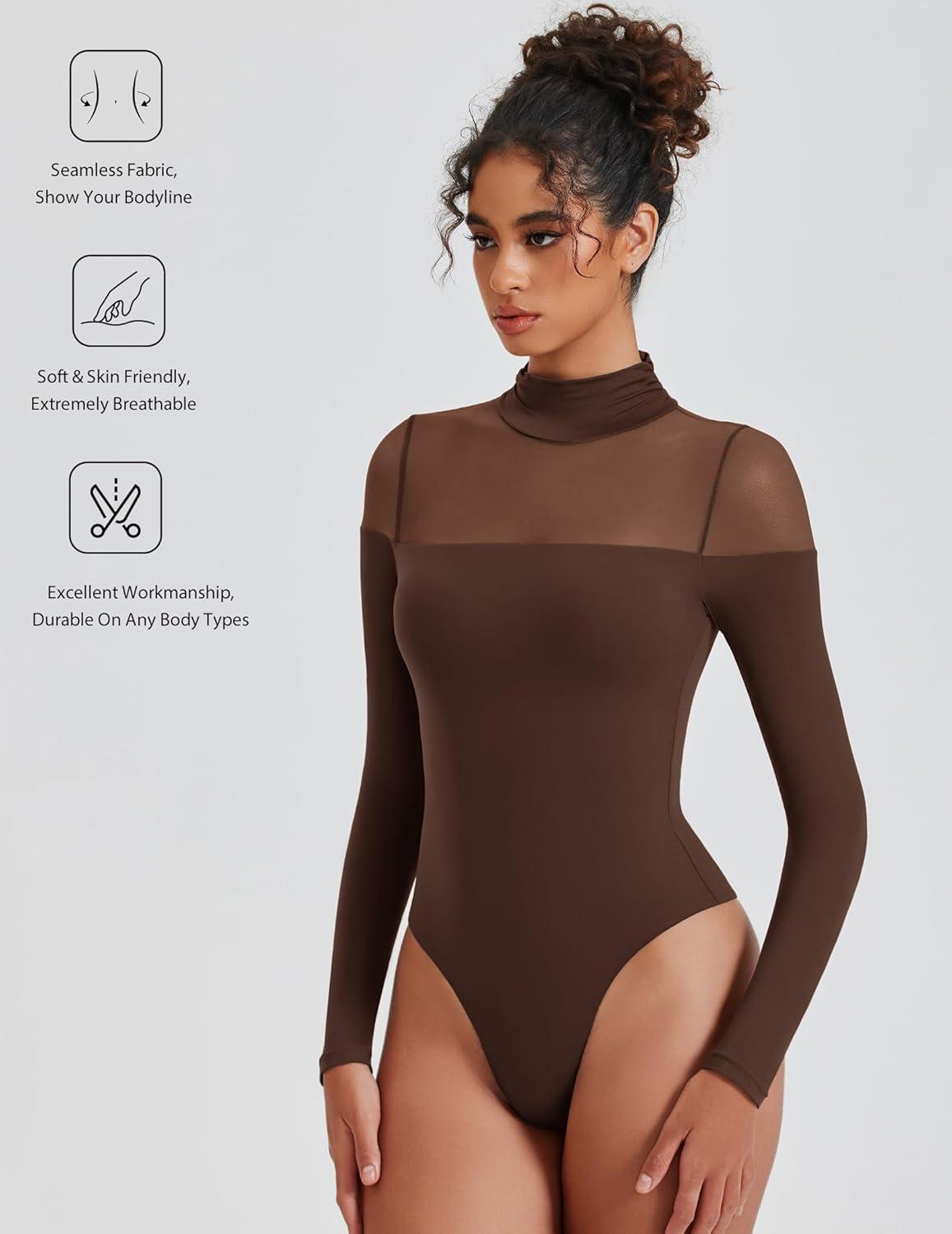 imageAvidlove Womens Long Sleeve Bodysuits Thong Turtle Neck Body Suit Mesh Going Out Leotard Tops One PieceBrown