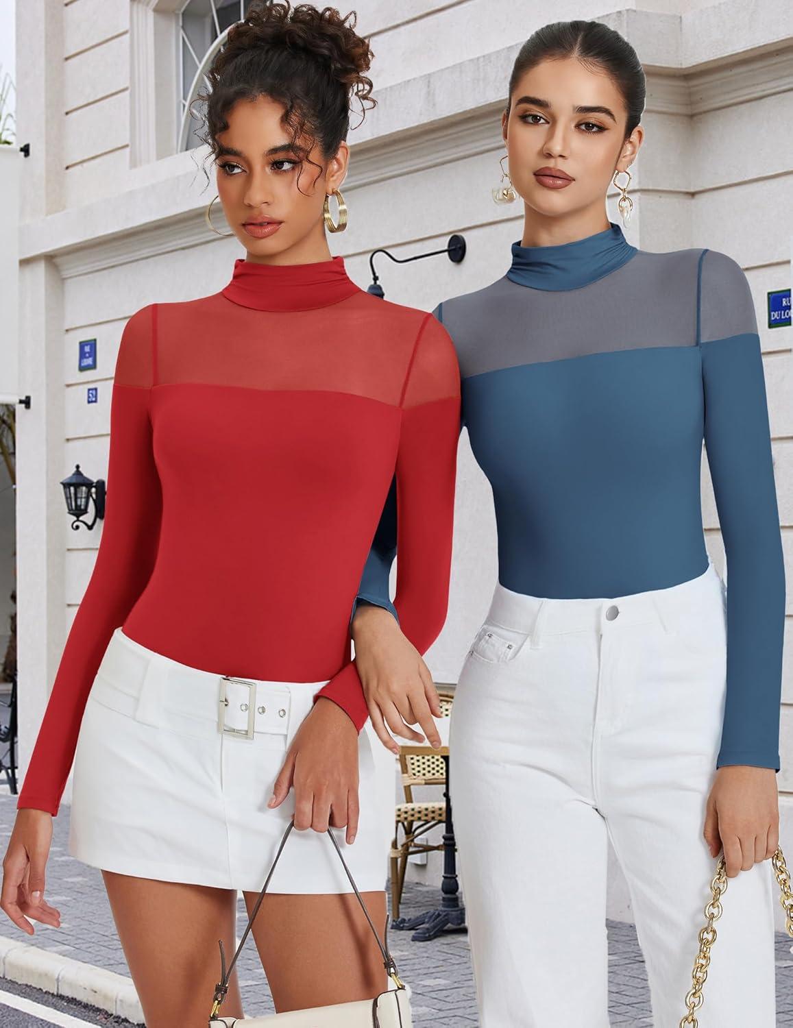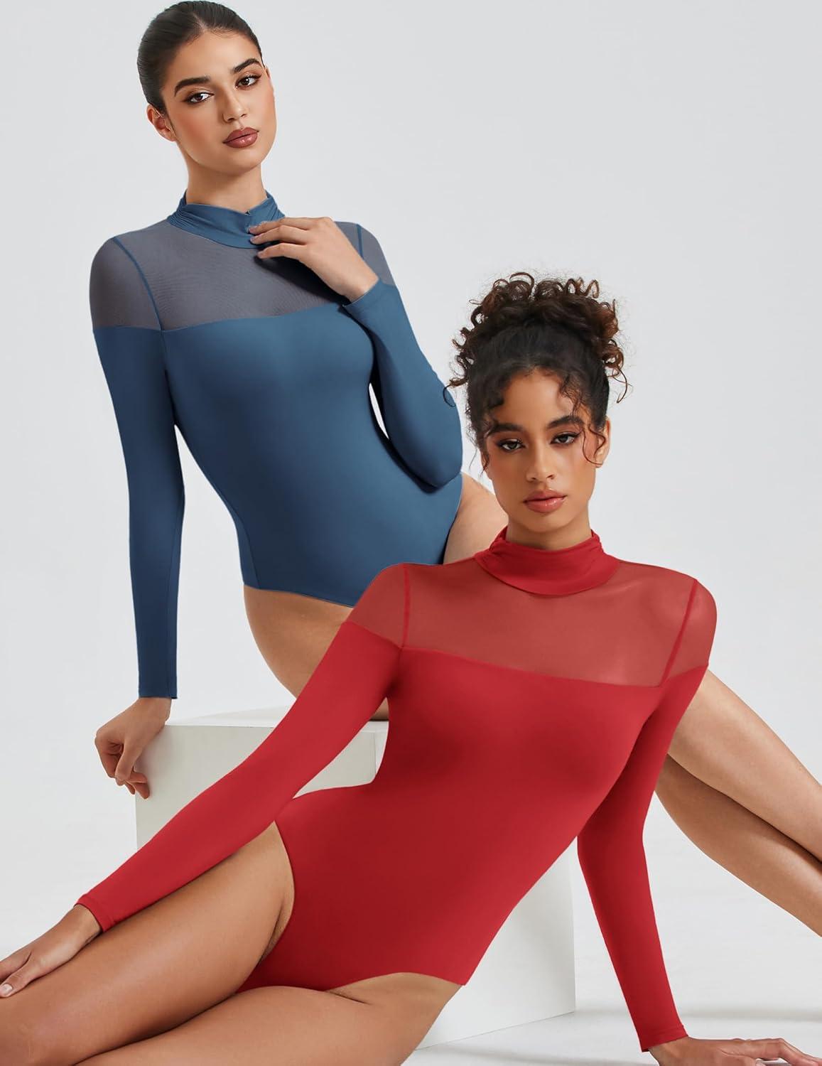 Avidlove Women’s Long Sleeve Bodysuits Thong Turtle Neck Body Suit Mesh Going Out Leotard Tops One Piece(Dark Blue)
