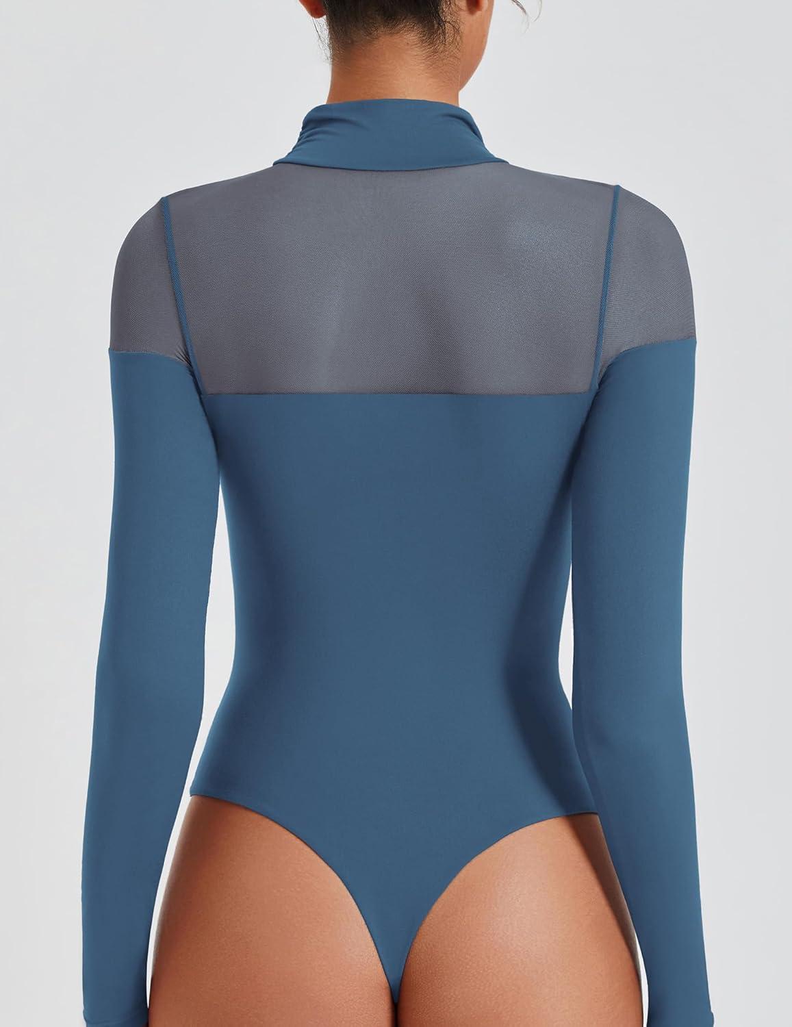 Avidlove Women's Long Sleeve Bodysuits Thong Turtle Neck Body Suit Mesh Going Out Leotard Tops One Piece(Dark Blue)