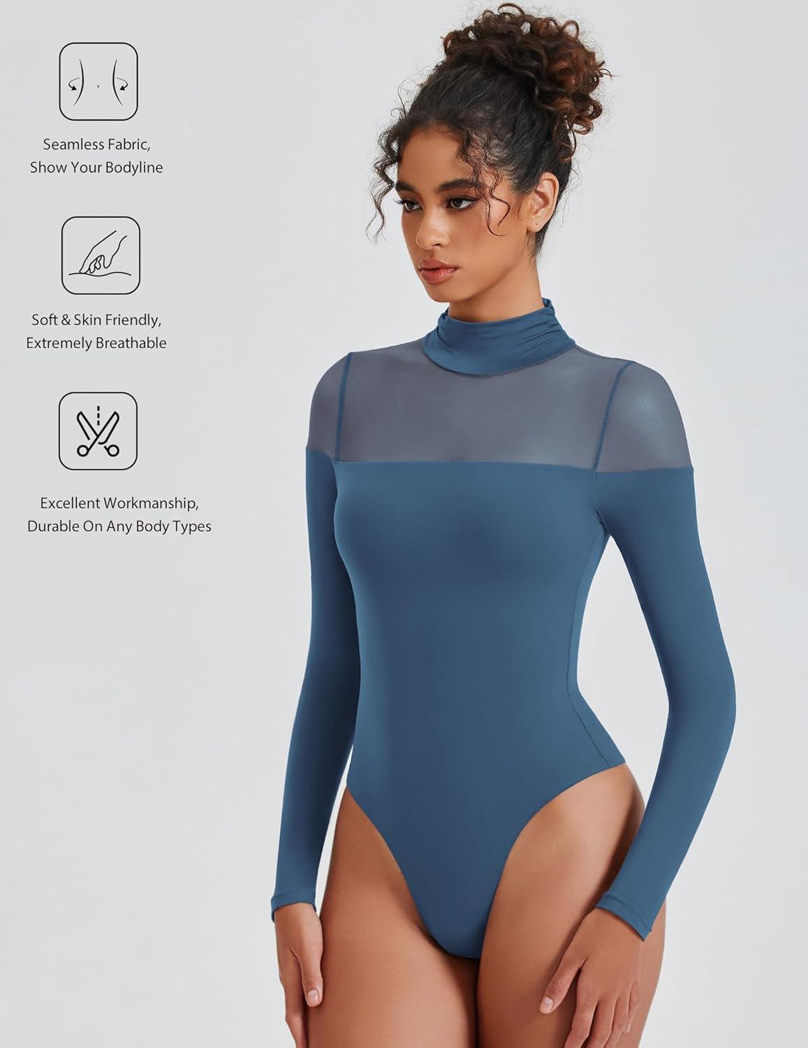 imageAvidlove Womens Long Sleeve Bodysuits Thong Turtle Neck Body Suit Mesh Going Out Leotard Tops One PieceDark Blue