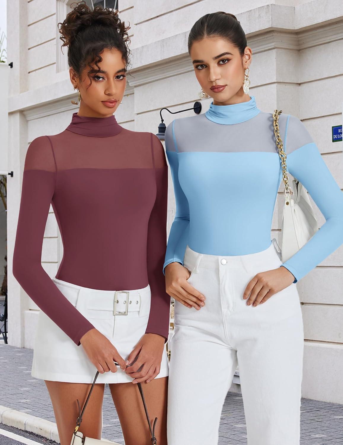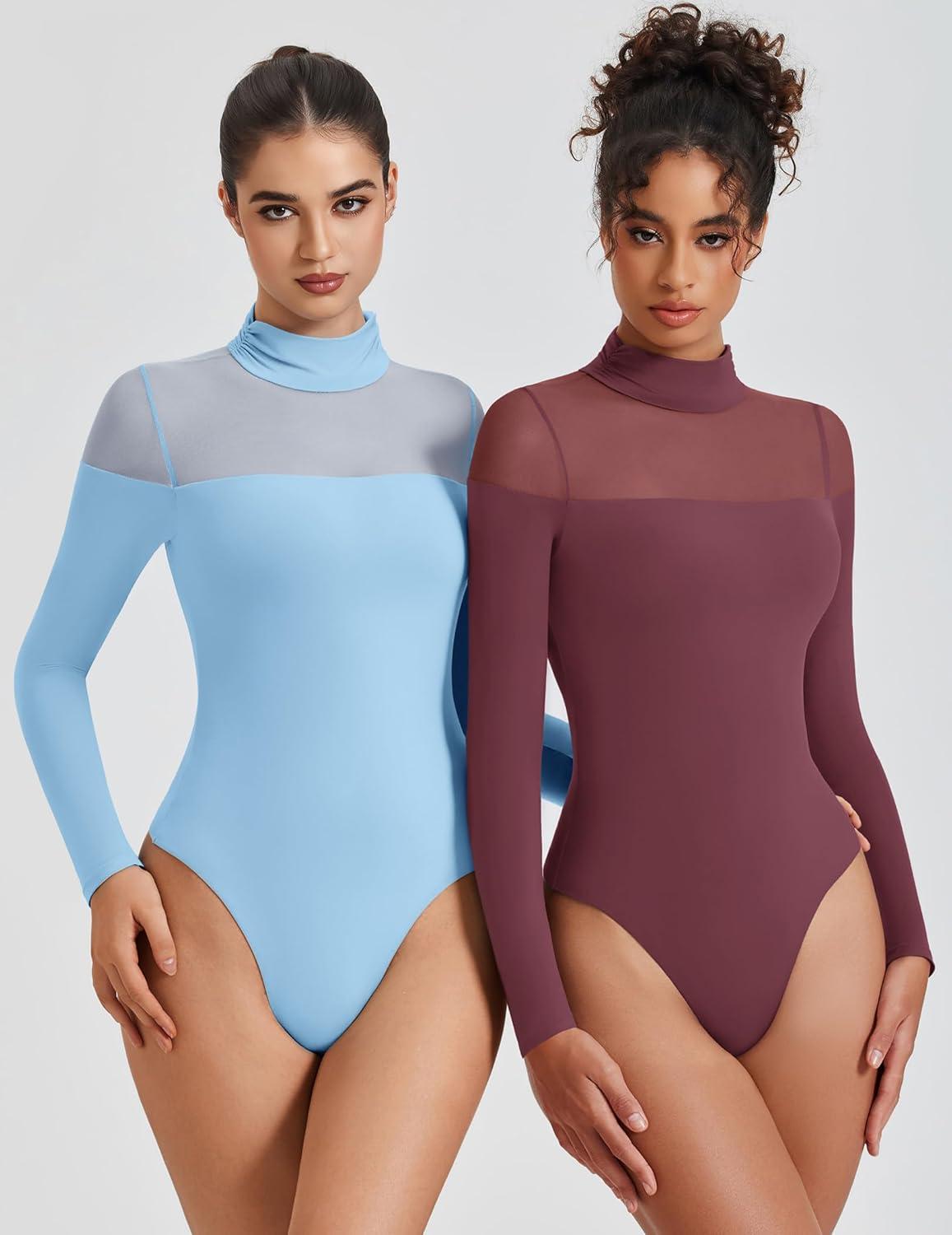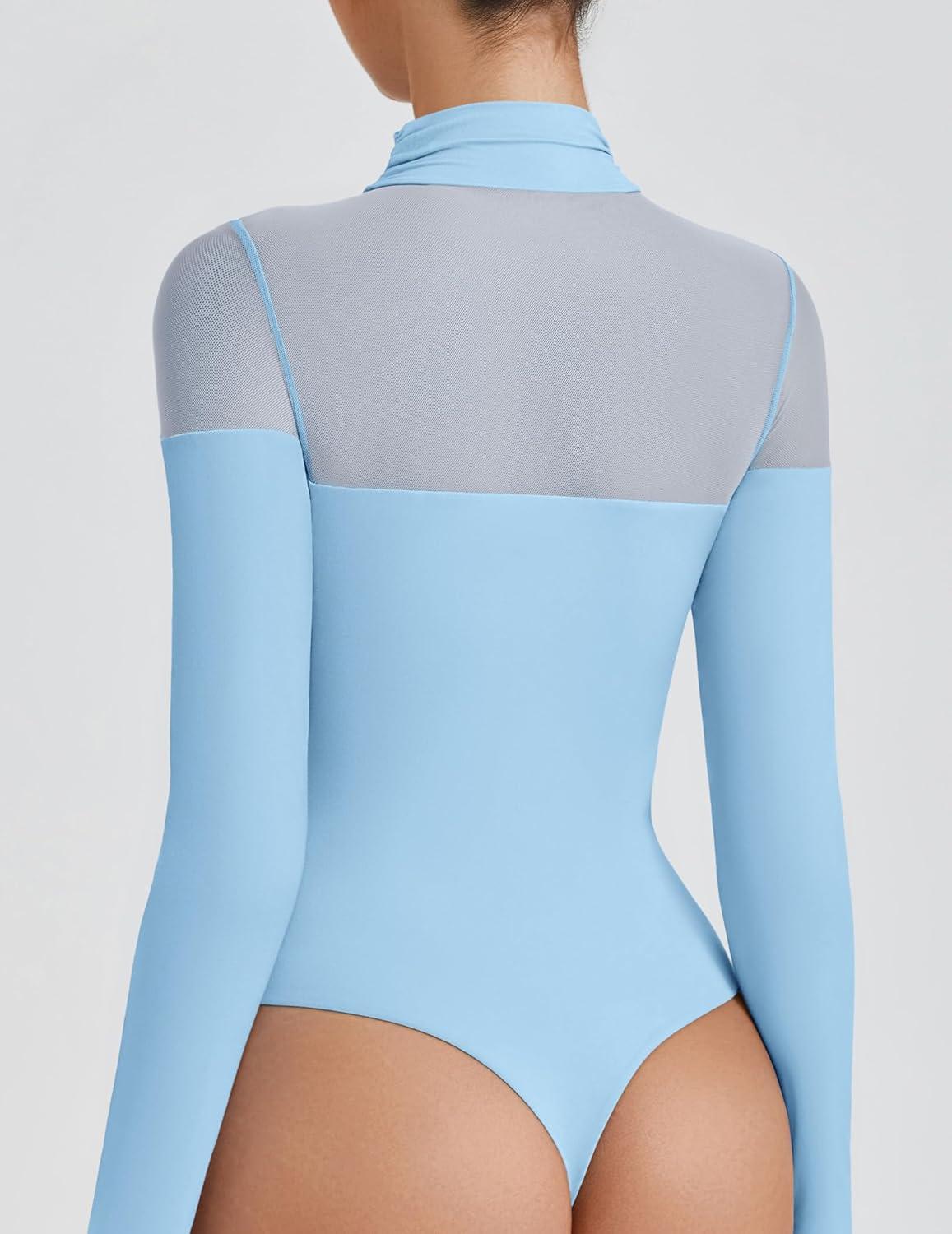 Avidlove Women’s Long Sleeve Bodysuits Thong Turtle Neck Body Suit Mesh Going Out Leotard Tops One Piece(Light Blue)