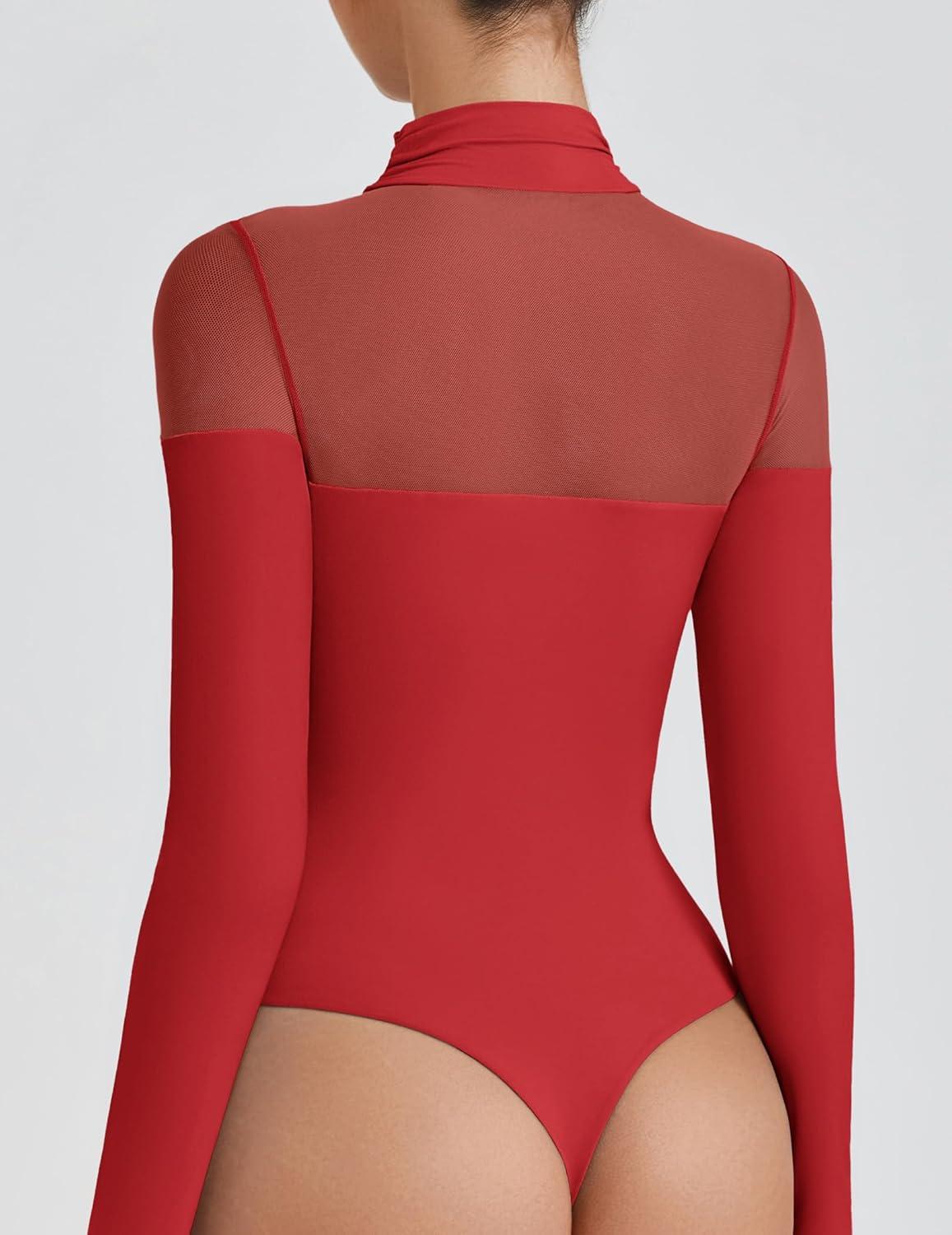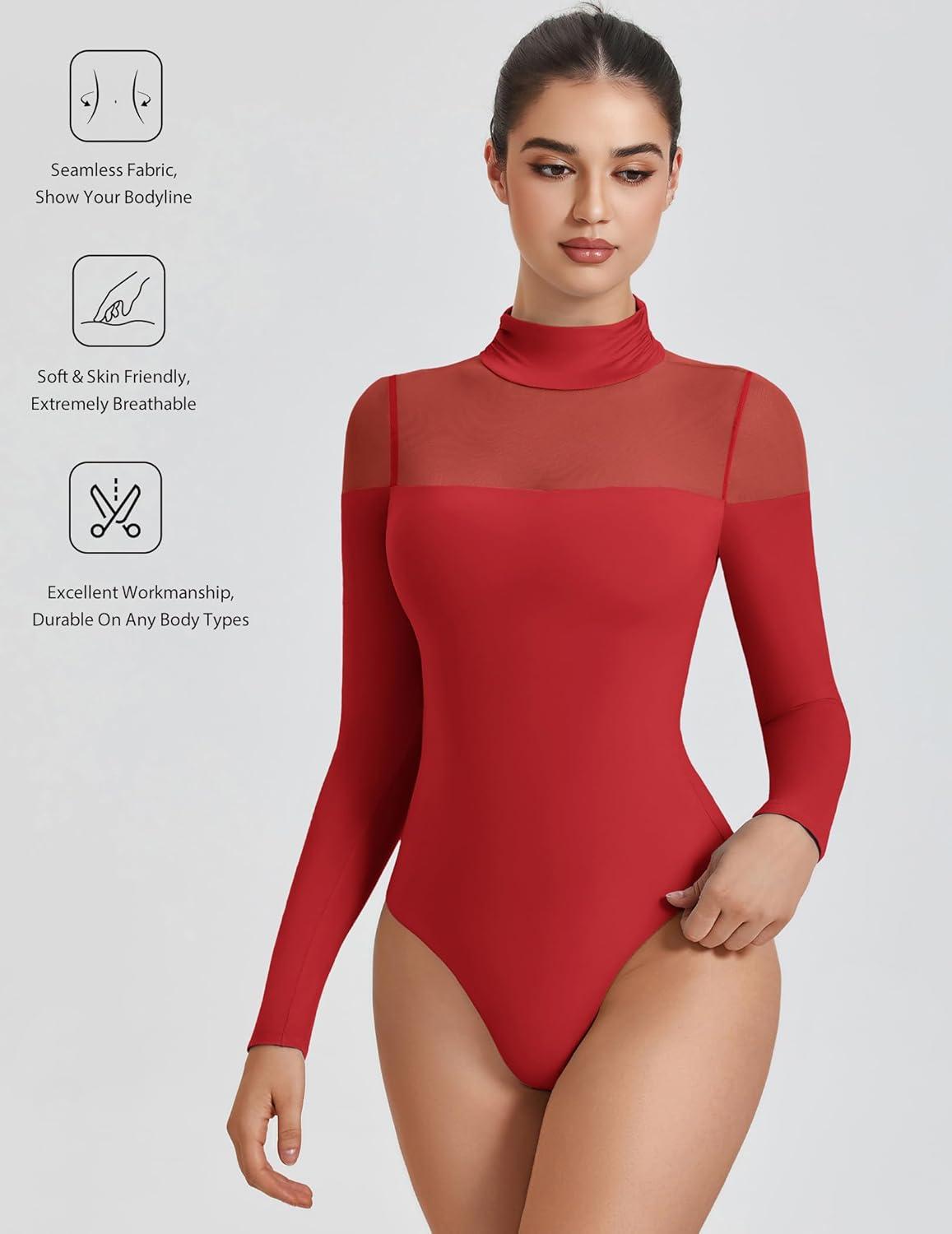 imageAvidlove Womens Long Sleeve Bodysuits Thong Turtle Neck Body Suit Mesh Going Out Leotard Tops One PieceRed