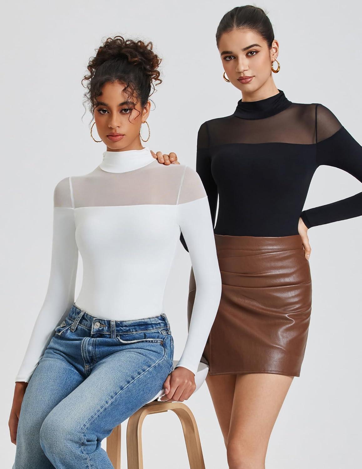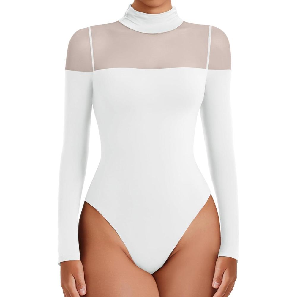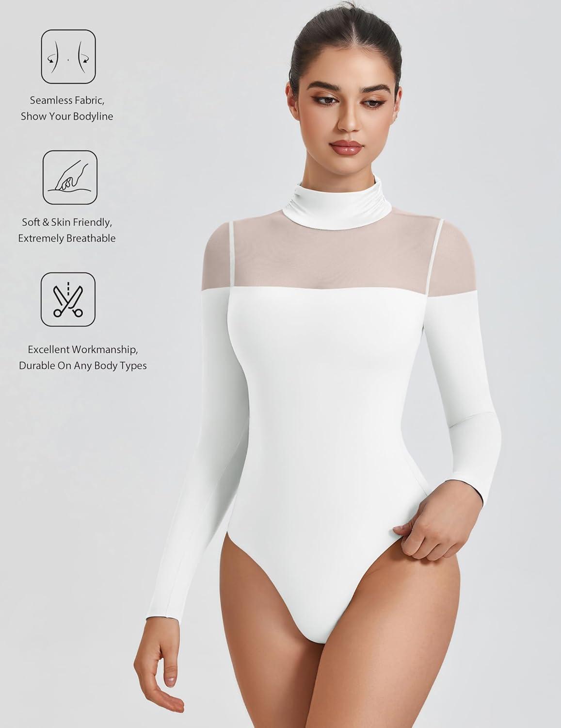 imageAvidlove Womens Long Sleeve Bodysuits Thong Turtle Neck Body Suit Mesh Going Out Leotard Tops One PieceWhite