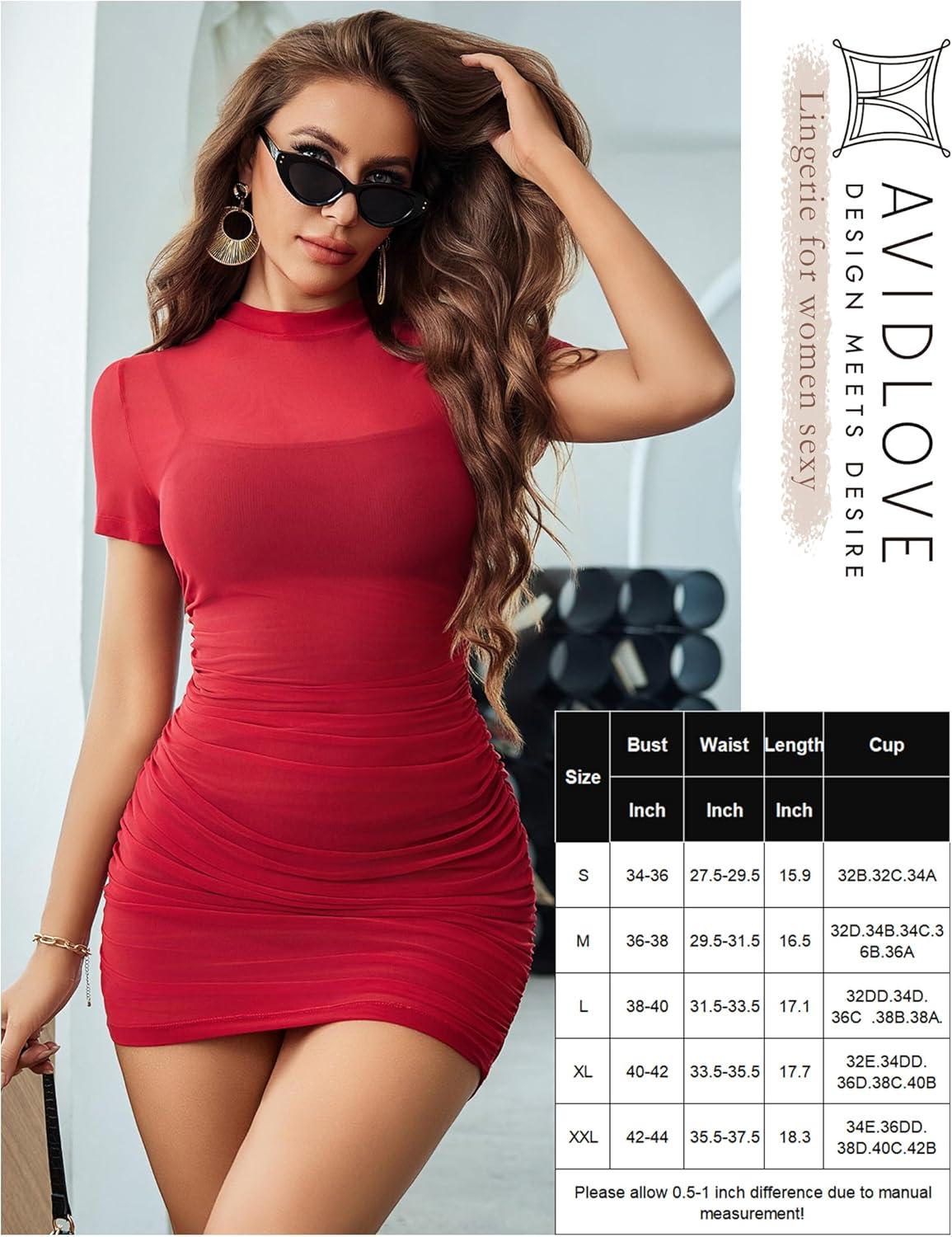 Avidlove Women’s Mesh Dress Bodycon Mini Lingerie Dress Sexy Short Sleeve Mock Neck Ruched Party Clubwear Outfits S-XXL(Wine Red)