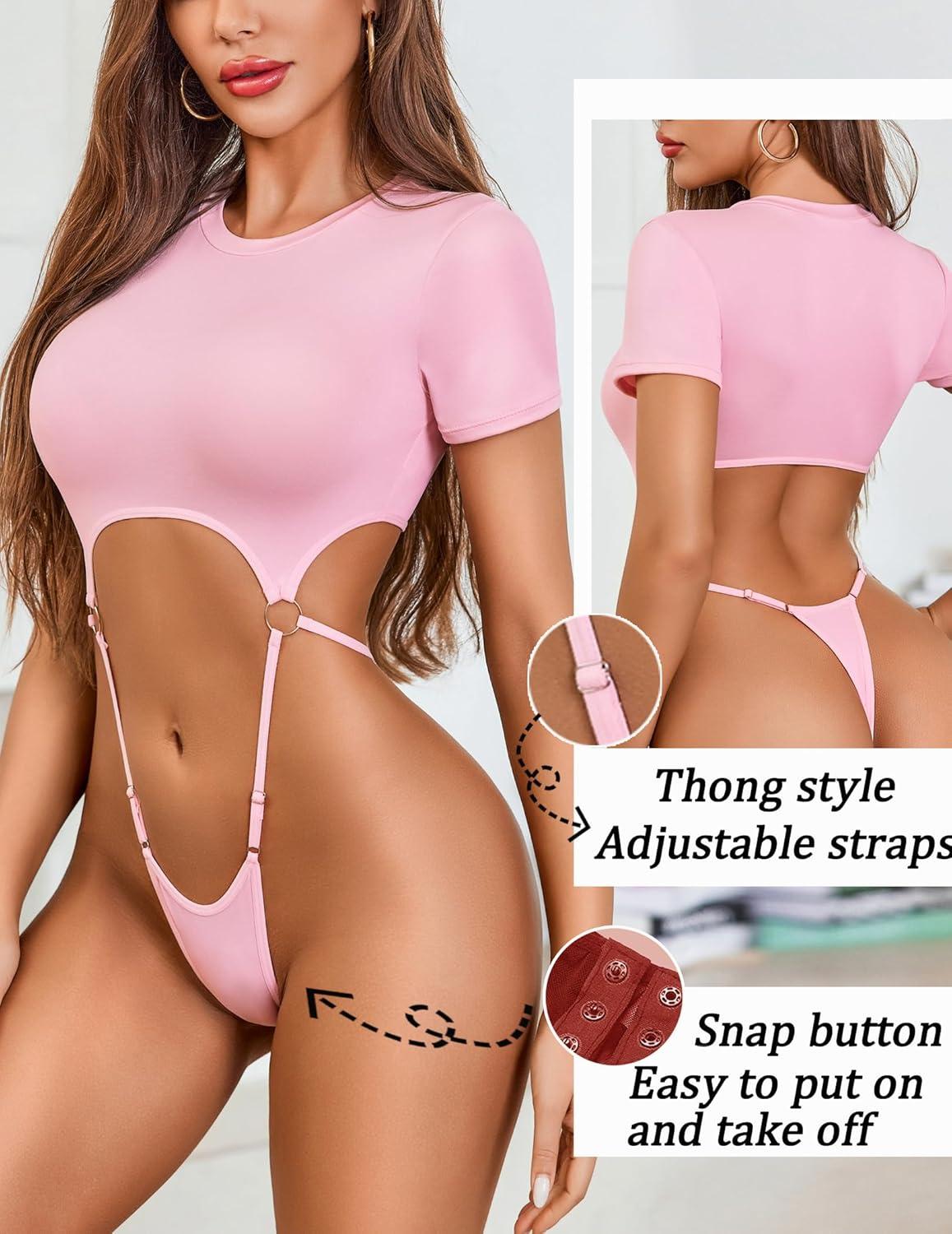 Avidlove Women's Sexy Cut Out Lingerie Bodysuit Short Sleeve Tshirt Body Suits Slim Fit Crew Neck Crop Tops(Pink)