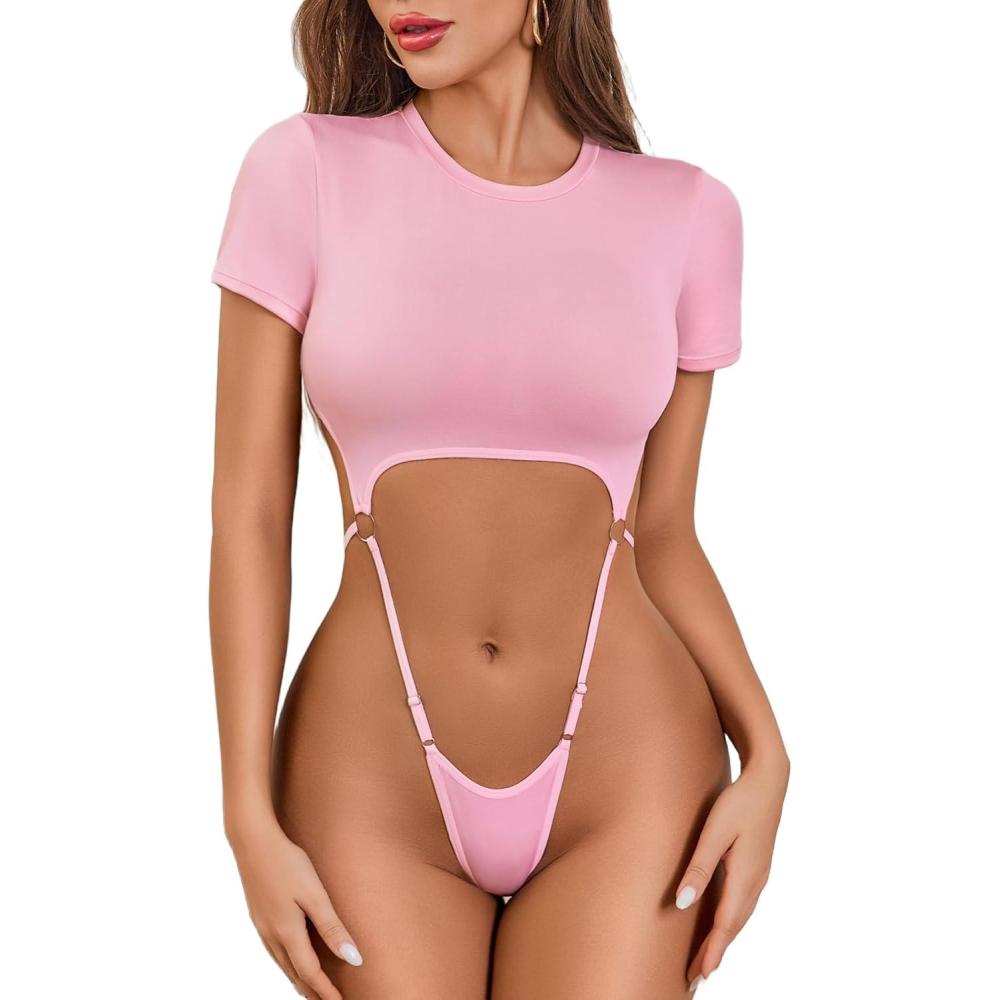 Avidlove Women’s Sexy Cut Out Lingerie Bodysuit Short Sleeve Tshirt Body Suits Slim Fit Crew Neck Crop Tops(Pink)