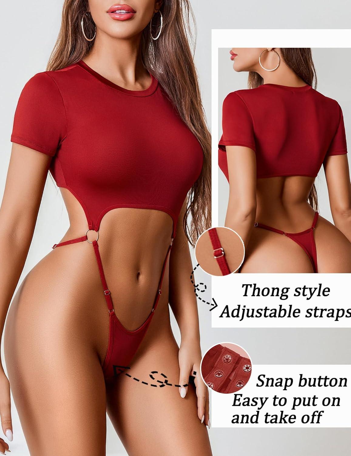 Avidlove Women's Sexy Cut Out Lingerie Bodysuit Short Sleeve Tshirt Body Suits Slim Fit Crew Neck Crop Tops(Wine Red)