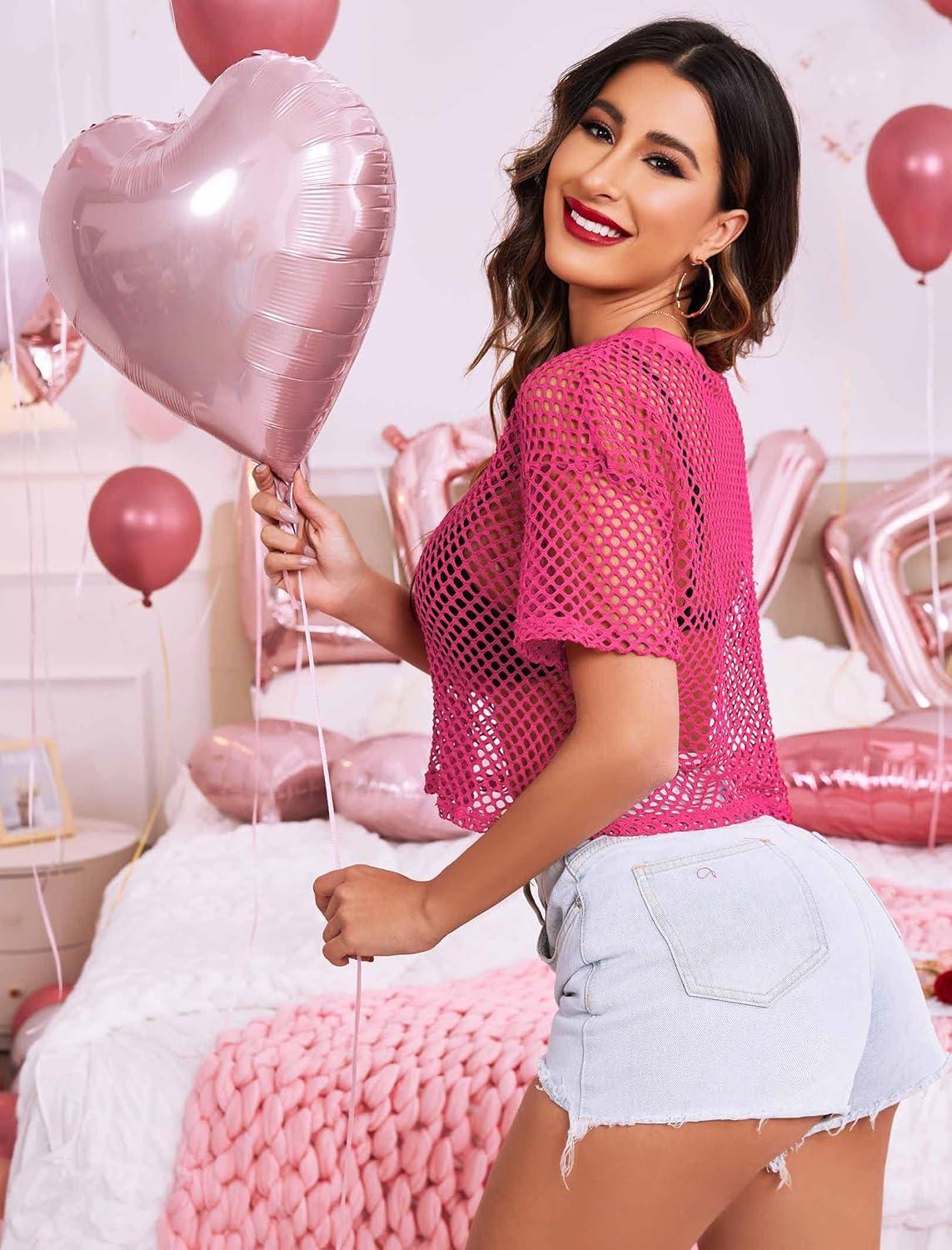 Avidlove Women’s Sheer Fishnet Top Sexy Short Sleeves Net T Shirts Crop Top(Hot Pink)