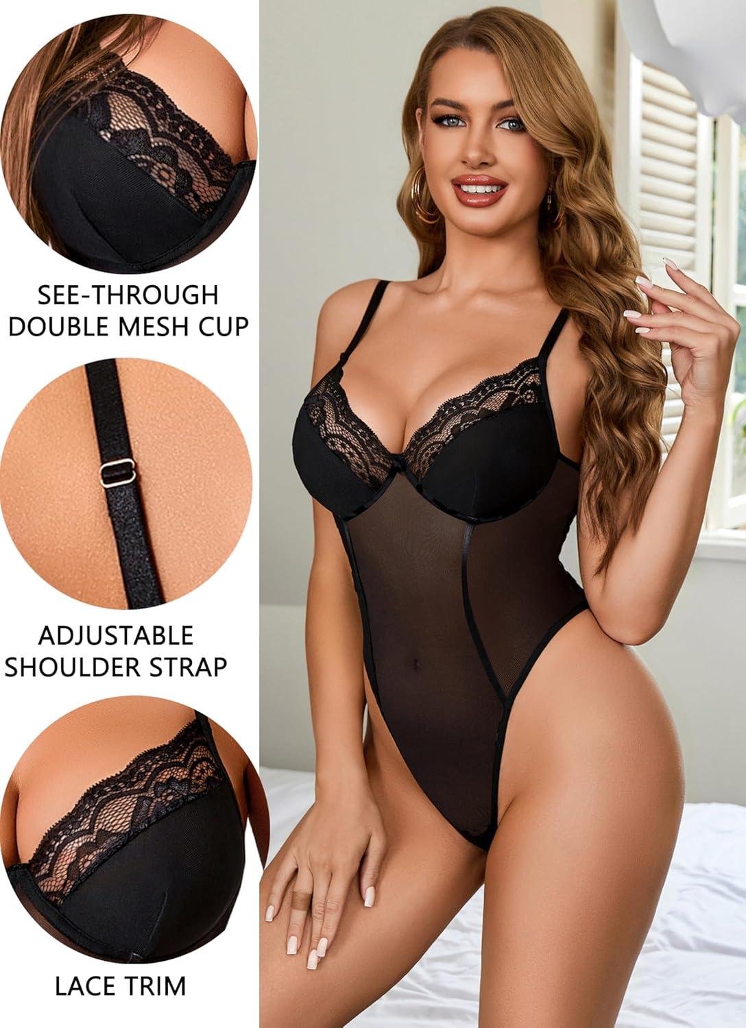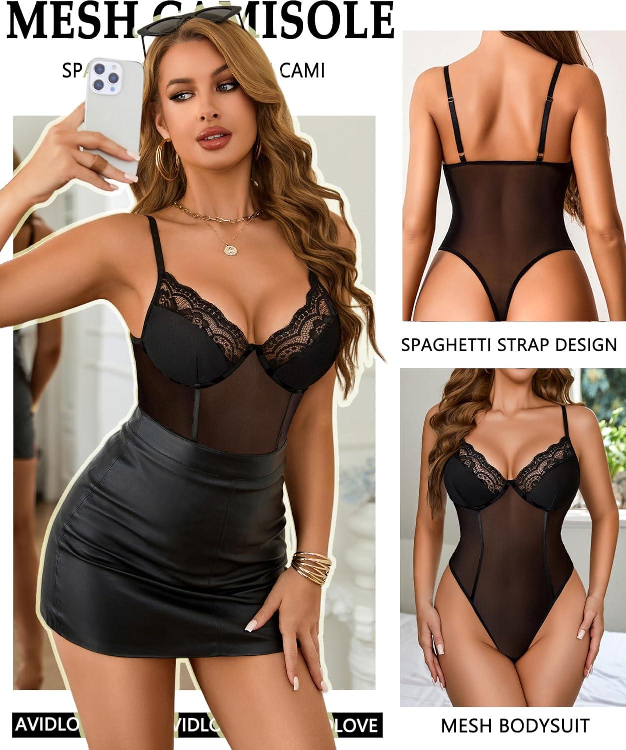 Avidlove Women’s Sheer Mesh Bodysuit with Lace Trim Sexy Camisole Date Nights Clubwear(Black)
