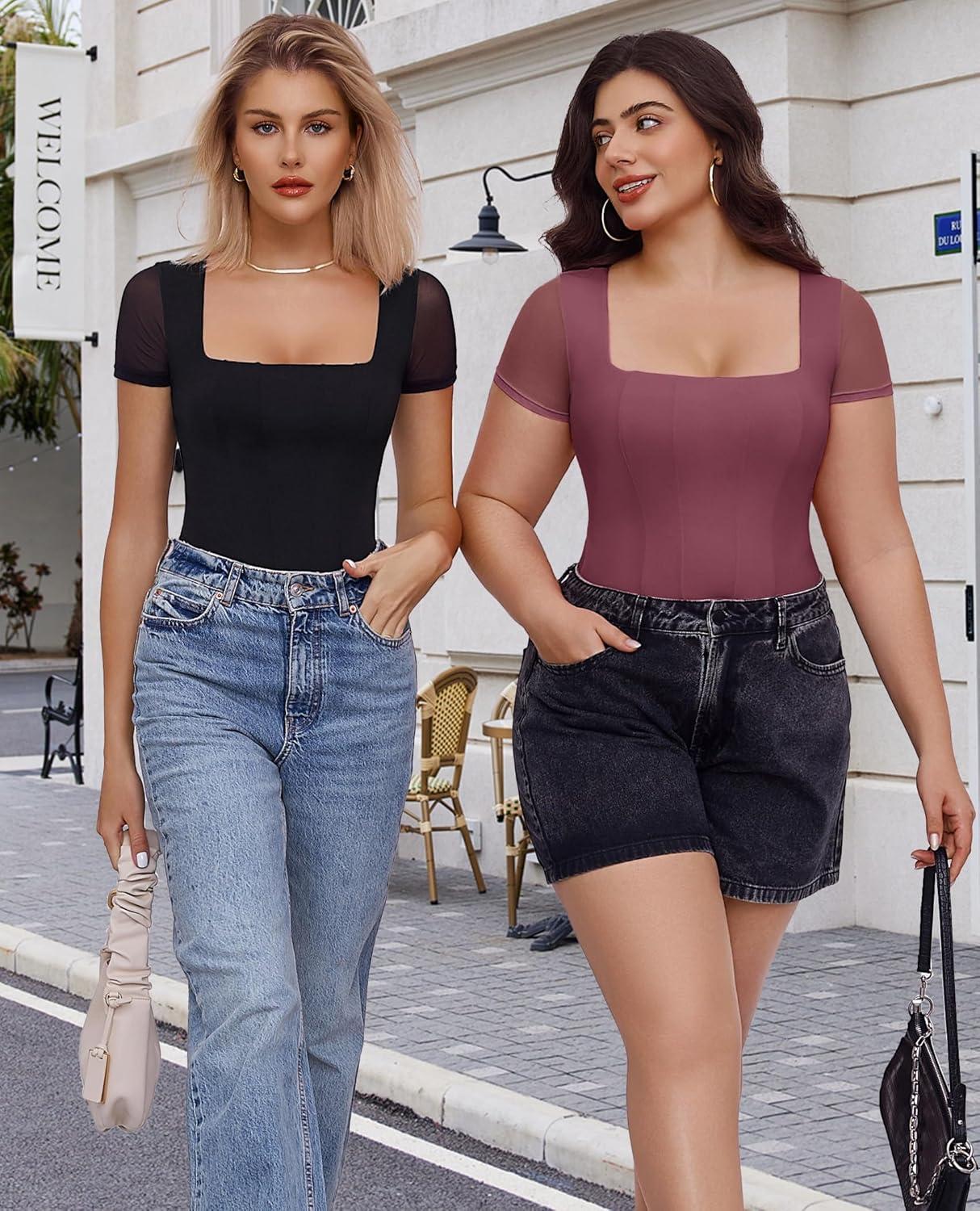 Avidlove Women’s Short Sleeve Bodysuits Sexy Square Neck Body Suit Mesh Double Lined Tshirt Leotard Tops Going Out(Red)