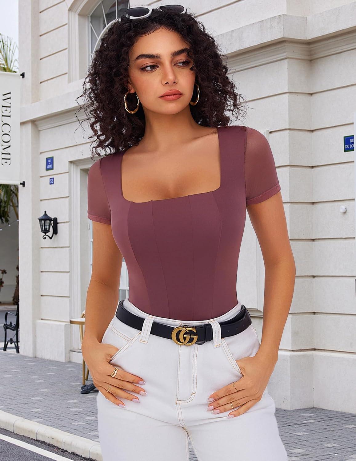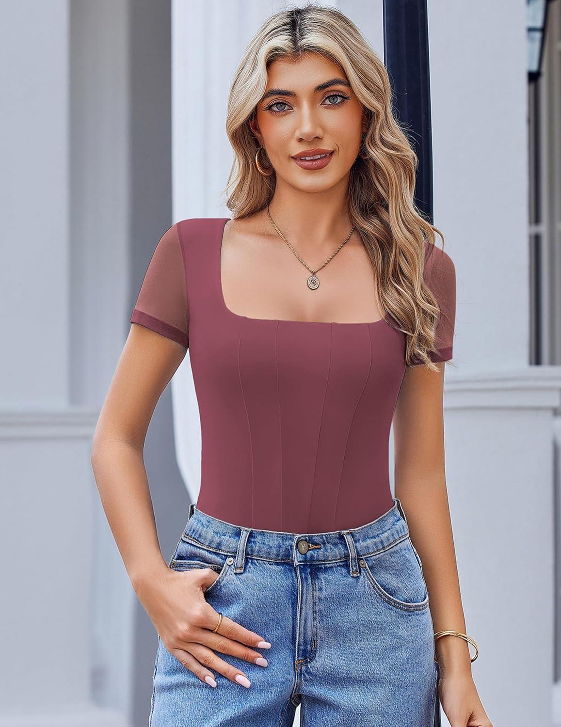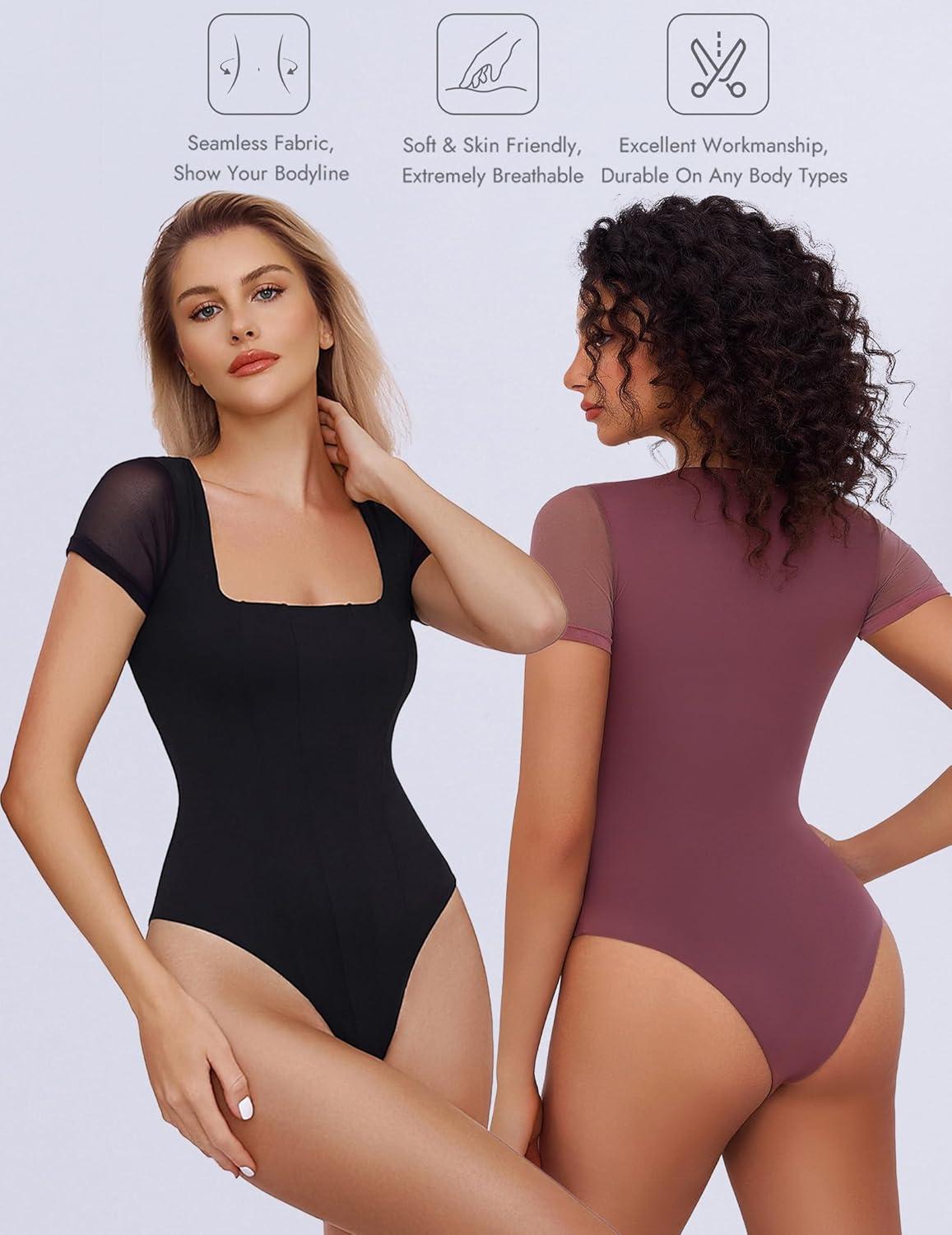 Avidlove Women's Short Sleeve Bodysuits Sexy Square Neck Body Suit Mesh Double Lined Tshirt Leotard Tops Going Out(Purple Red)