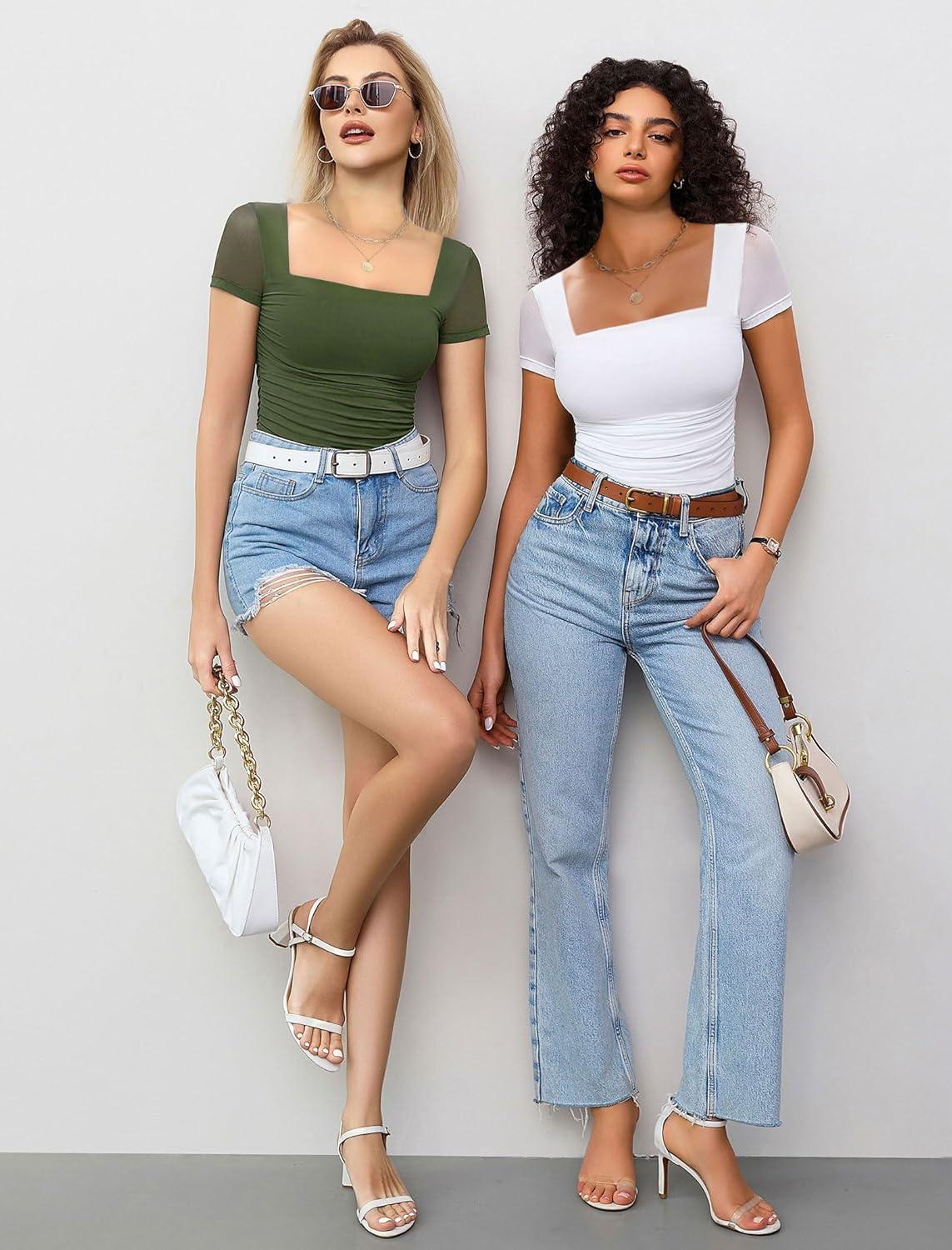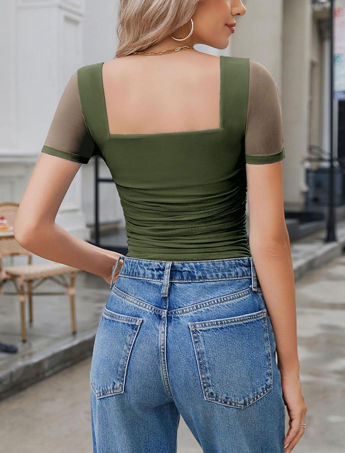 Avidlove Women’s Square Neck Sheer Mesh Short Sleeve Bodysuit Ruched Going Out Sexy Thong Bodysuits Tops(Army Green)