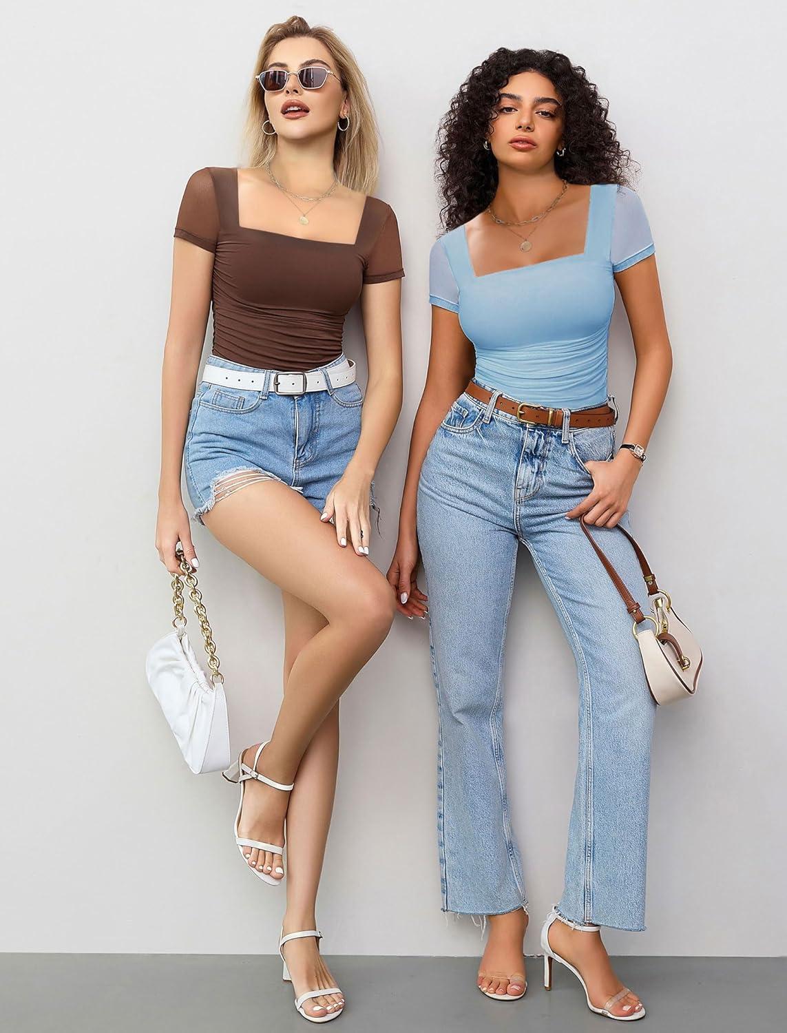 Avidlove Women’s Square Neck Sheer Mesh Short Sleeve Bodysuit Ruched Going Out Sexy Thong Bodysuits Tops(Clear Blue)