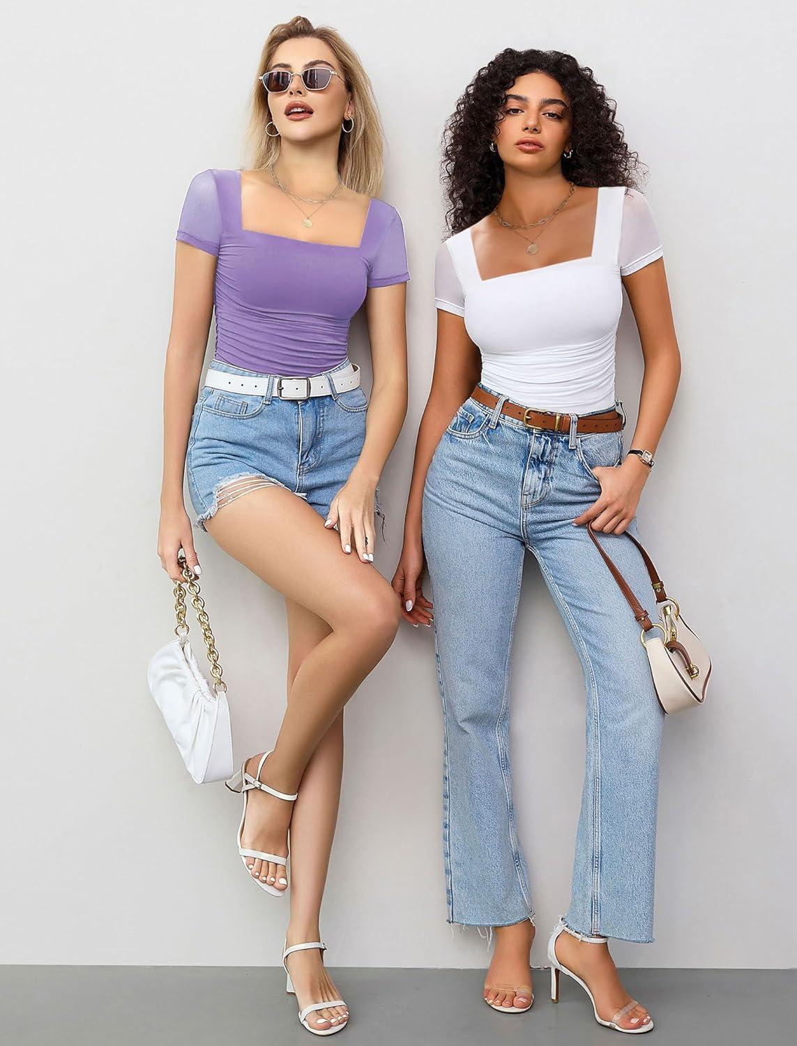 Avidlove Women’s Square Neck Sheer Mesh Short Sleeve Bodysuit Ruched Going Out Sexy Thong Bodysuits Tops(Violet)